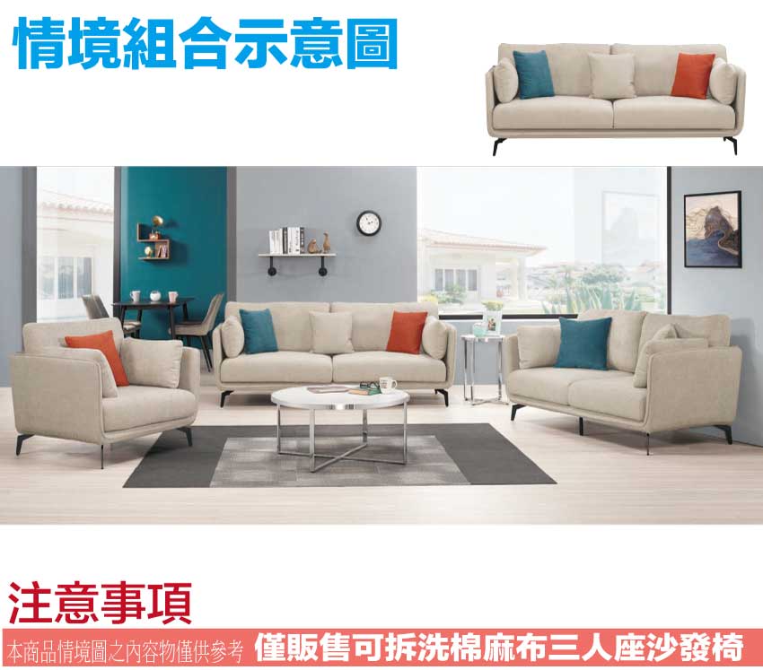 【文創集】林德亞麻色透氣棉麻布三人座沙發椅 時尚亞麻色系+現代美型外觀+安心材質製造,就是這種頂級質感的設計,能輕鬆地融入各種空間風格,採用內部實木板材框架+烤漆金屬腳座+透氣棉麻布料+高回彈力加厚泡棉等安心材質製造,品質安心有保障,現在購買專人送到府服務,免組裝+免運費,讓你省時省力省運費!