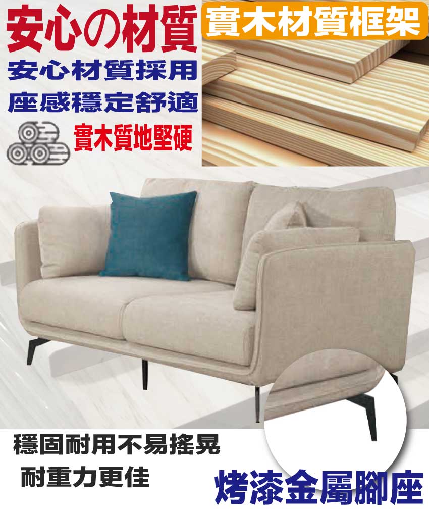 採用內部實木板材框架+烤漆金屬腳座+透氣棉麻布料+高回彈力加厚泡棉等安心材質製造