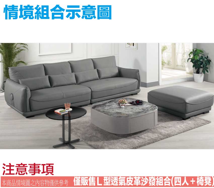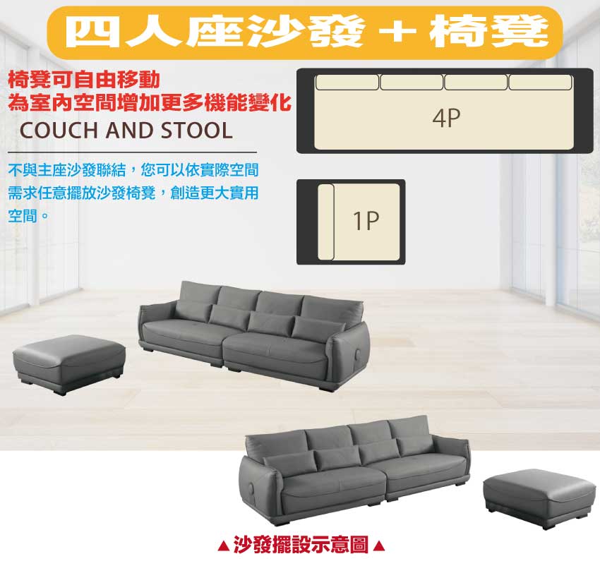 此組L型沙發椅為四人座+椅凳組合,椅凳可視使用需求自由擺放增加居家空間變化便利性