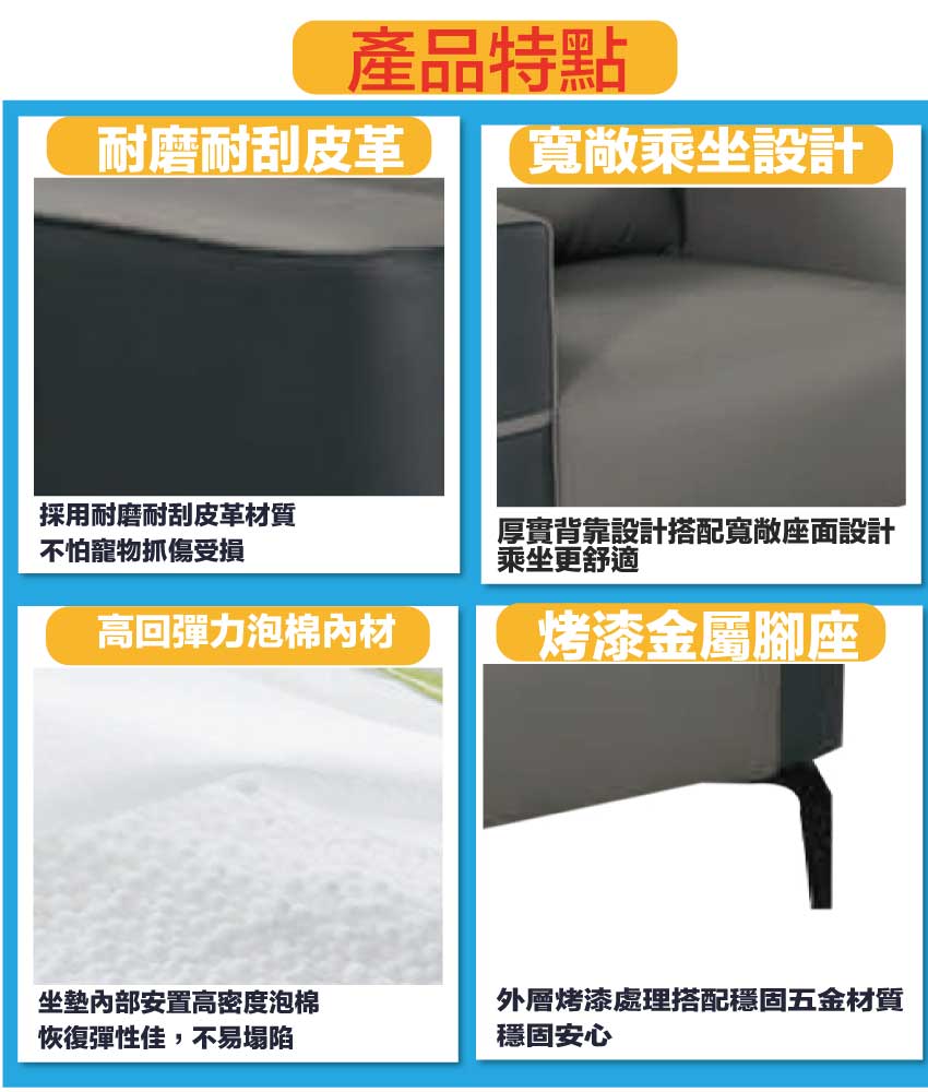 採用內部實木板材框架+烤漆金屬腳座+耐磨貓抓皮革+高回彈力加厚泡棉等安心材質製造