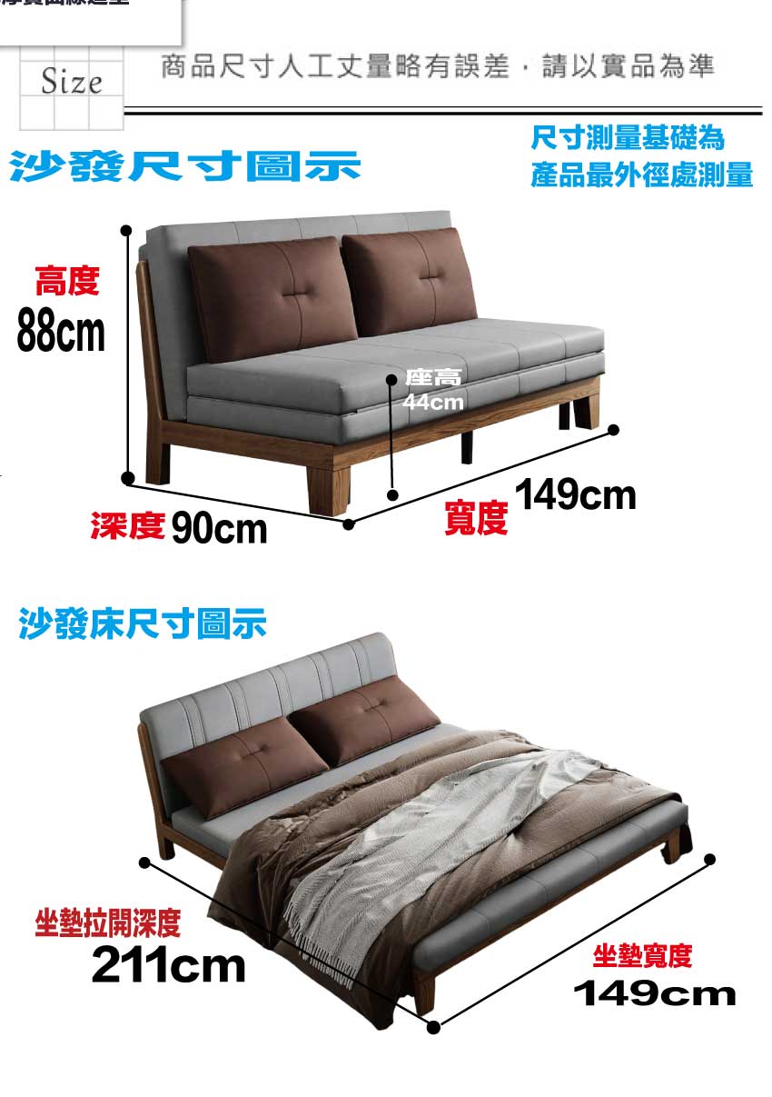 沙發床尺寸:(坐墊寬)149x(深)211x(座高)44公分