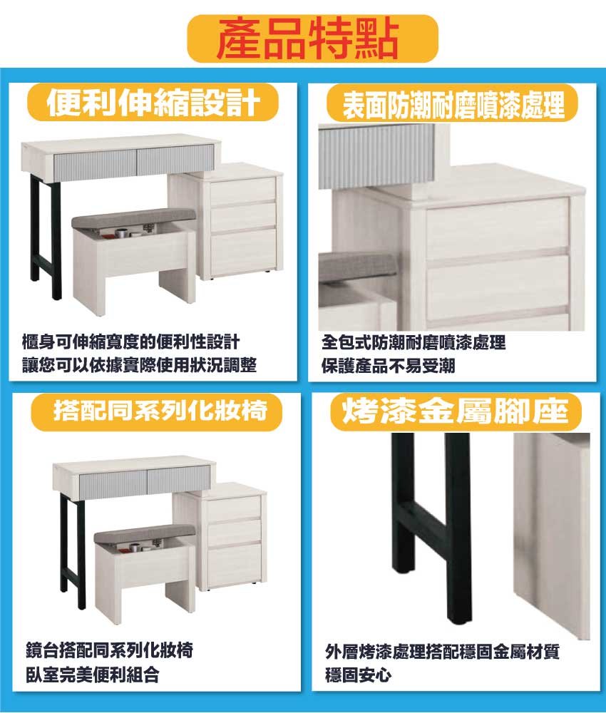 鏡台櫃身寬度可調整80-110cm使用搭配可掀蓋收納化妝椅凳,滿足您居家空間使用便利性
