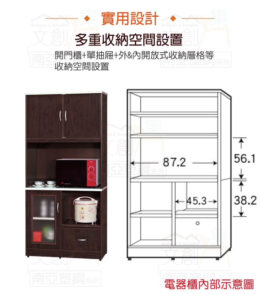 【文創集】尼爾 環保3尺南亞塑鋼三門單抽高餐櫃/收納櫃組合 產品採用第一品牌-台製南亞塑鋼舒美板+五金滑軌結構材質,整體材質採用防水+防燃+無甲醛安心塑鋼材質製造 ,搭配開門櫃+單抽屜+內&外開放式層格+拉合式層架等便利收納空間設計,防止受潮,增加支撐力,堅固不會塌陷,全由專人配送到家,專業安心服務,替你省下更多時間!
