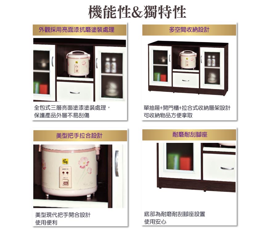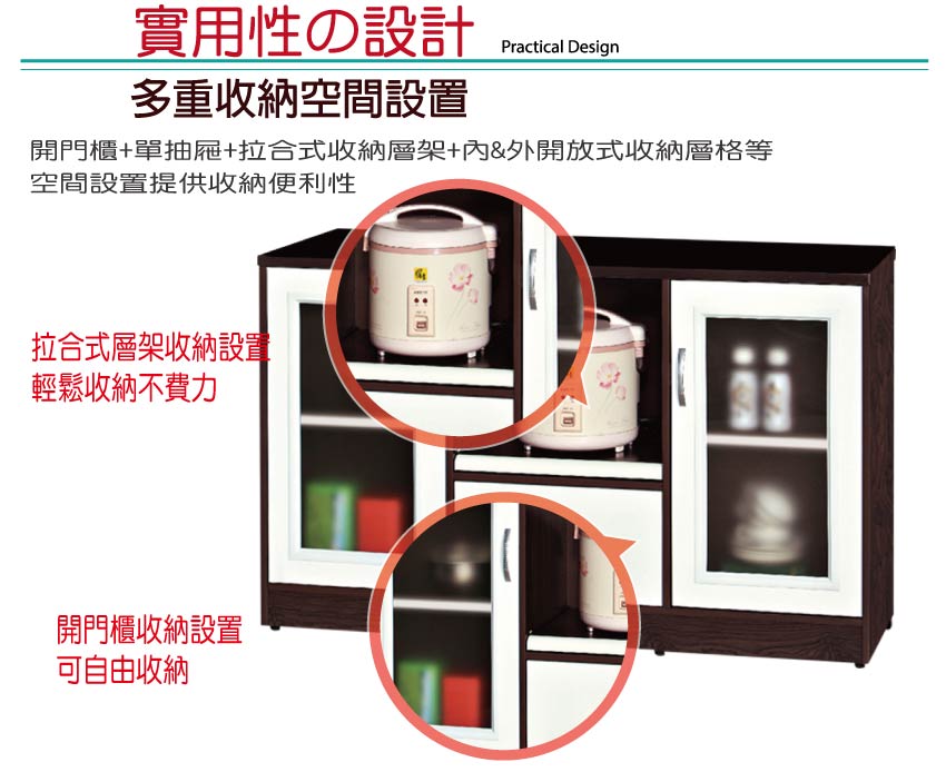 開門櫃+單抽屜+內&外開放式層格+拉合式層架等便利收納空間設計