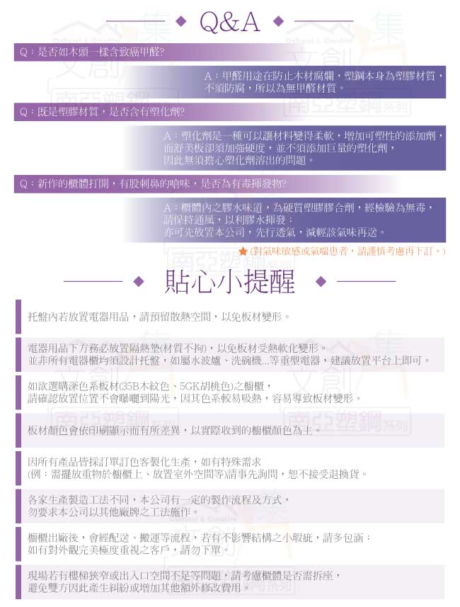 請注意:本公司所販售南亞塑鋼產品為保障消費者權益及維護產品品質的考量,產品皆為接單後生產組裝(配送產品為已組裝完成之半成品),等待週期約10-14天工作天(不含實際配送日期等待天數),請您訂購前務必事先確認是否可以等待,避免引發不必要之消費爭議,如有不便之處請見諒!