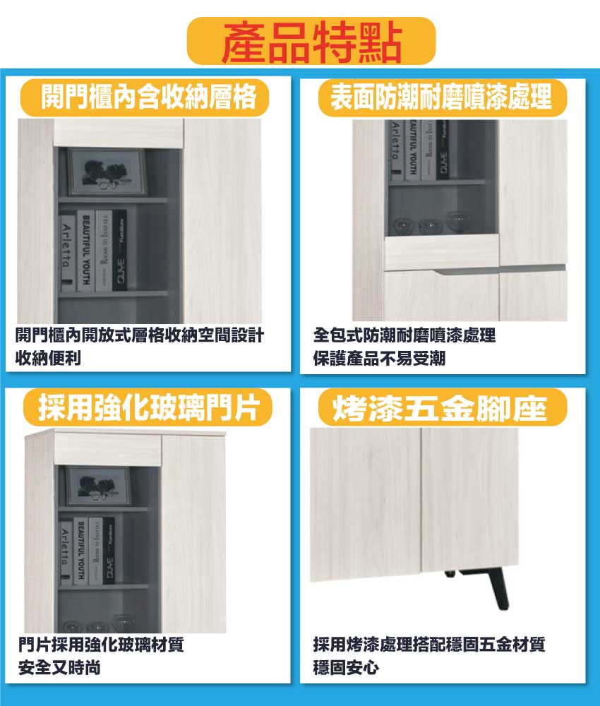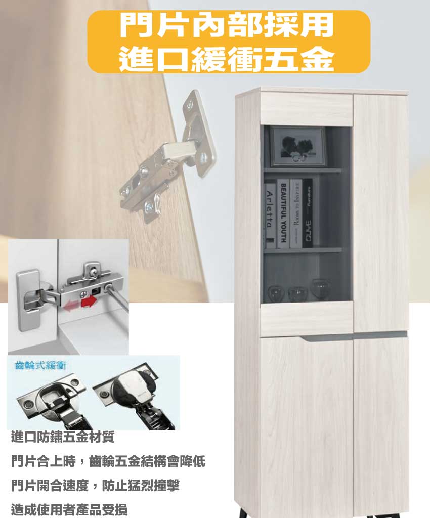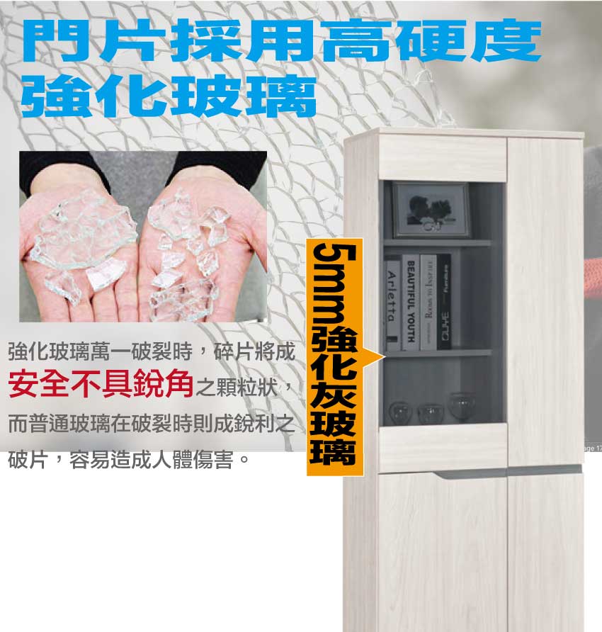 材質:防蛀木心板+烤漆五金腳座+防夾手緩衝門片五金+5mm強化灰玻璃