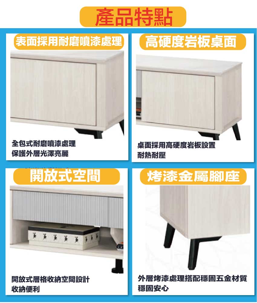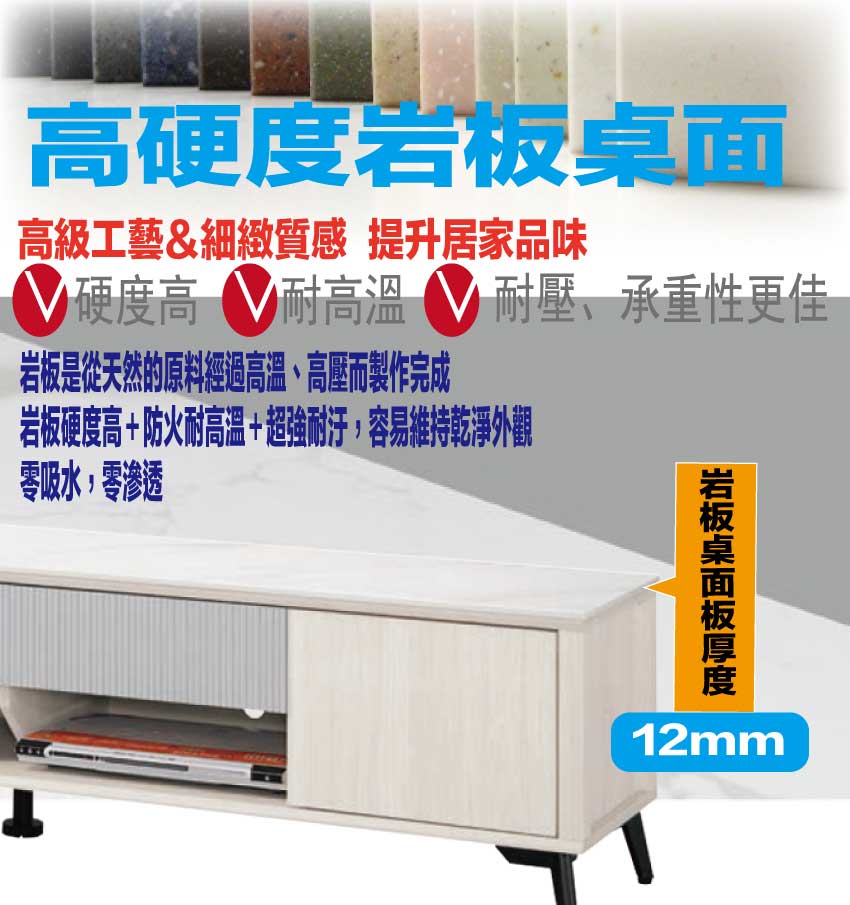 材質:防蛀木心板+防潮MDF板材(灰色耐磨面板)+烤漆五金腳座+防夾手緩衝門片五金+五金滑軌結構+12mm高硬度岩板桌面板