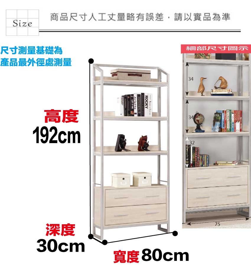 【文創集】華華爾2.7尺開放二抽金屬邊框書櫃(二色可選) 二色可選+安心材質製造,使用放心+搭配居家更便利,採用防蛀木心板+烤漆五金腳座+啞光銀金屬邊框等安心材質製造 ,外層採用防潮耐磨噴漆處理搭配採用二抽屜+開放層格等收納空間設計,全由專人配送到家,專業安心服務,替你省下更多時間!