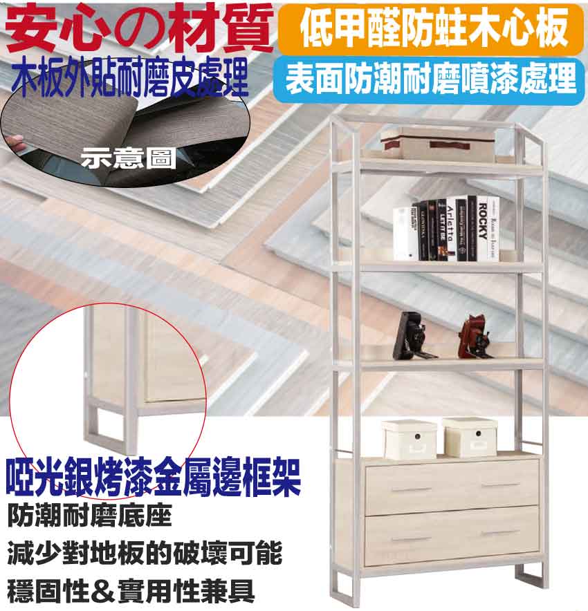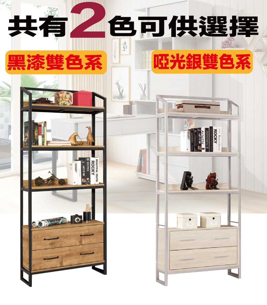 【文創集】華華爾2.7尺開放二抽金屬邊框書櫃(二色可選) 二色可選+安心材質製造,使用放心+搭配居家更便利,採用防蛀木心板+烤漆五金腳座+啞光銀金屬邊框等安心材質製造 ,外層採用防潮耐磨噴漆處理搭配採用二抽屜+開放層格等收納空間設計,全由專人配送到家,專業安心服務,替你省下更多時間!