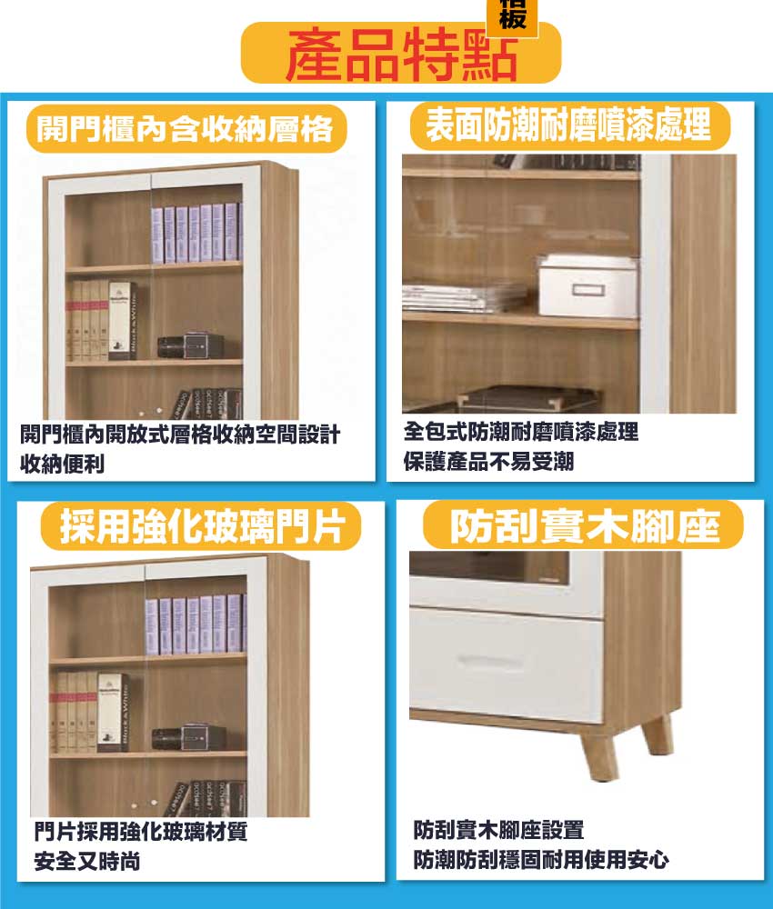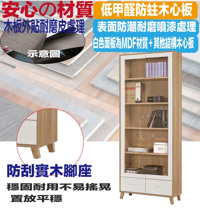 【文創集】卡蜜雙色2.7尺二門二抽書櫃 木紋雙色系+安心材質製造,使用放心+搭配居家更便利,採用防蛀木心板+防潮MDF板(白色面板)+防刮實木腳座+5mm強化玻璃等安心材質製造 ,外層採用防潮耐磨噴漆處理搭配採用開門櫃+二抽屜+內開放層格等收納空間設計,全由專人配送到家,專業安心服務,替你省下更多時間!