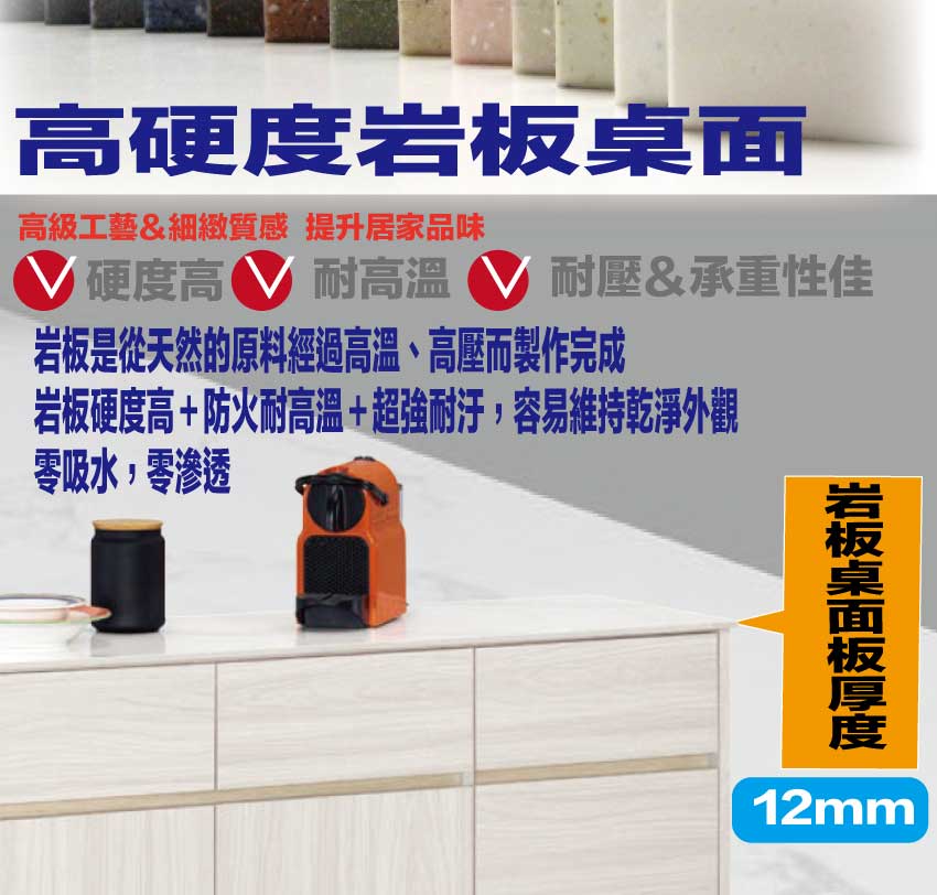 材質:防蛀木心板+防潮耐磨腳座+防夾手緩衝門片五金+12mm高硬度岩板桌面板+五金滑軌結構