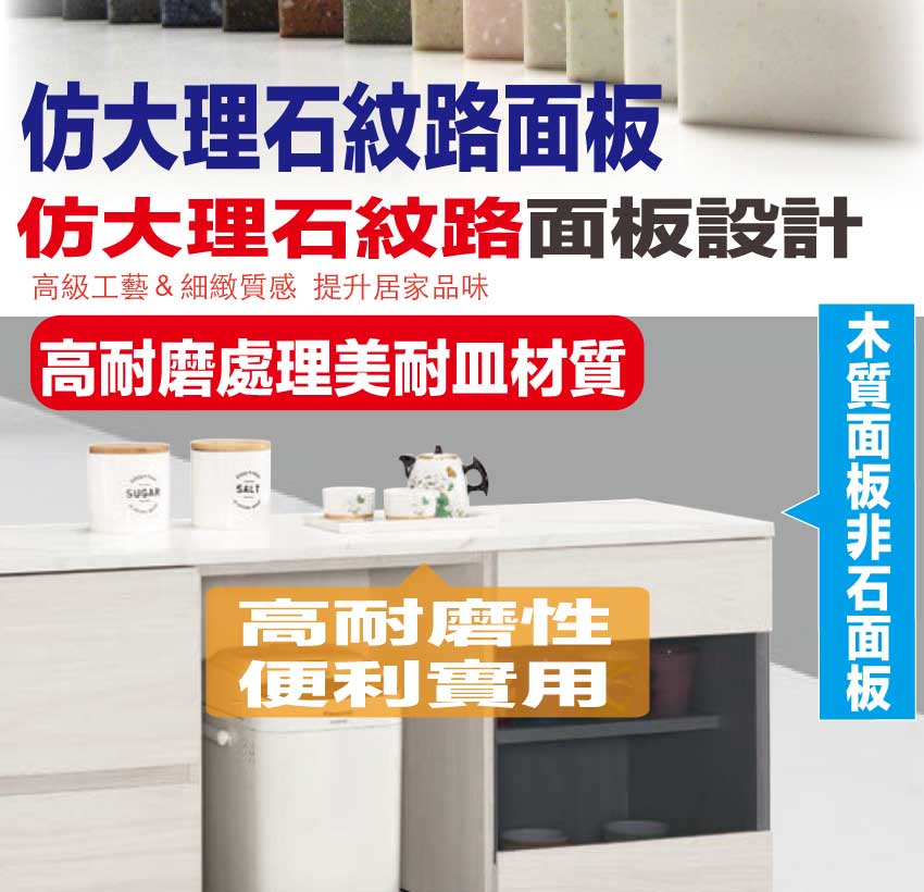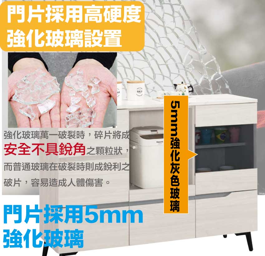 材質:防蛀木心板+烤漆五金腳座+防夾手緩衝門片五金+5mm強化灰玻璃+仿石紋耐磨美耐皿桌面板+五金滑軌結構