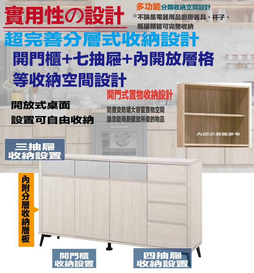搭配採用開門櫃+六抽屜+內開放層格等收納空間設計