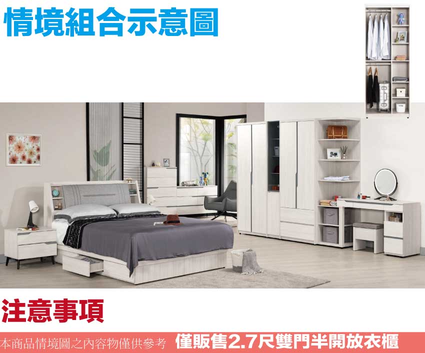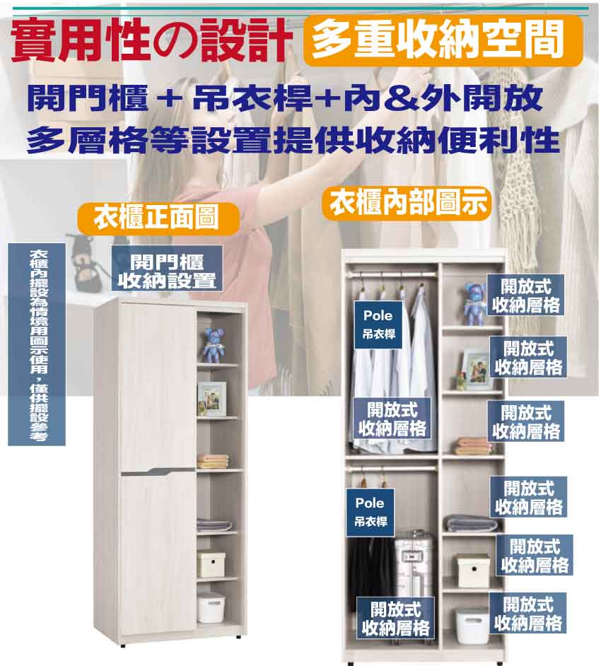 搭配採用開門櫃+吊衣桿+內&外開放層格等收納空間設計