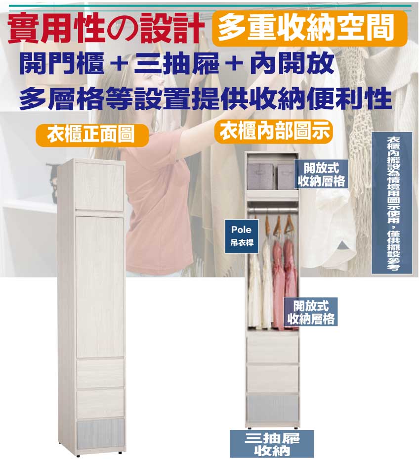 搭配採用開門櫃+吊衣桿+三抽屜+內開放層格等收納空間設計