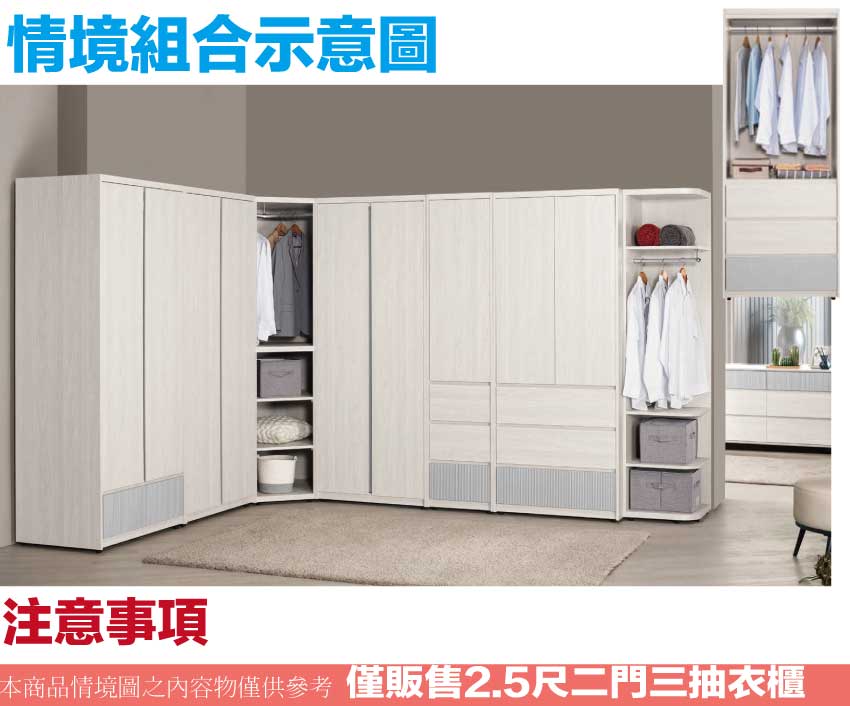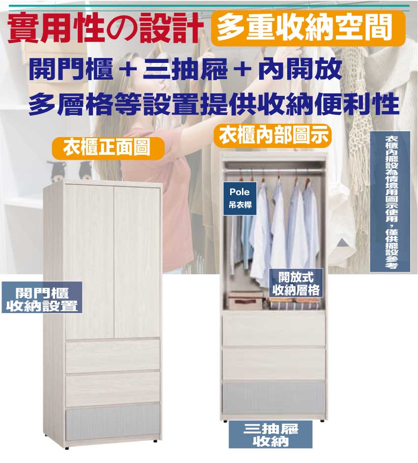 搭配採用開門櫃+吊衣桿+三抽屜+內開放層格等收納空間設計