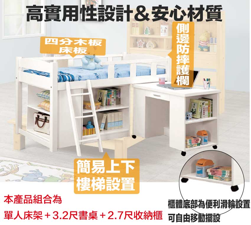 材質:松木實木+防蛀木心板+四分木床板+防潮實木腳座+側邊防摔護欄+簡易上下樓梯+便利滑輪設置
