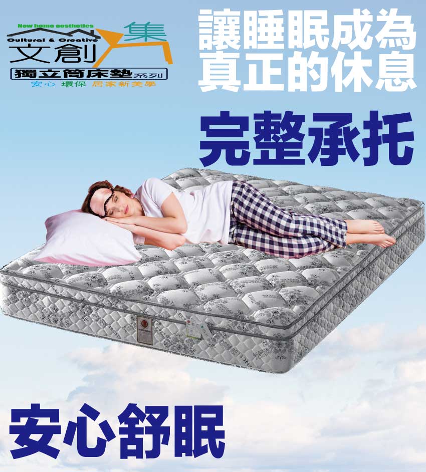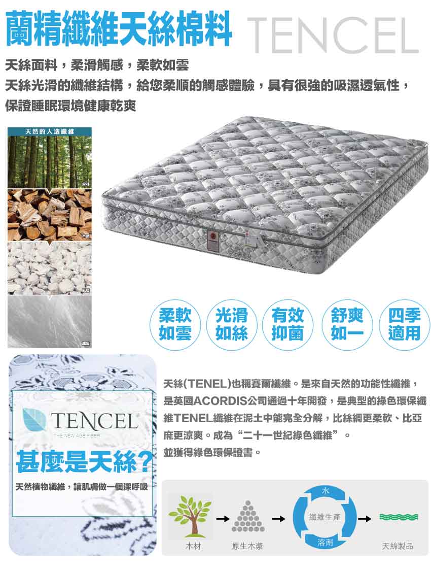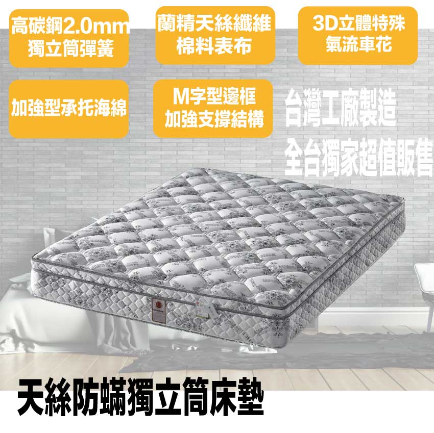 【文創集-床墊系列】3D天絲防蟎6尺雙人加大獨立筒床墊◆商品尺寸:(寬)180x (深)188 x (高)24公分◆商品材質:蘭精天絲纖維棉表布+瑞士Sanitized抗菌處理技術+防穿刺透氣棉+止滑透氣底布 +加強型承托海綿+高張力結晶長織棉+加強型四邊M型支撐邊框+3D立體特殊氣流車花+備長碳釋壓棉+高碳鋼746顆2.0mm靜音抗擾中鋼彈簧(袋裝獨立筒彈簧)◆商品保固:中鋼彈簧體保固5年(正常使用),保用10年本產品款式共有單人加大(105cm)&雙人(150cm)&雙人加大(180cm)等三種尺寸可供您選擇,請先確定床台的尺寸再購買