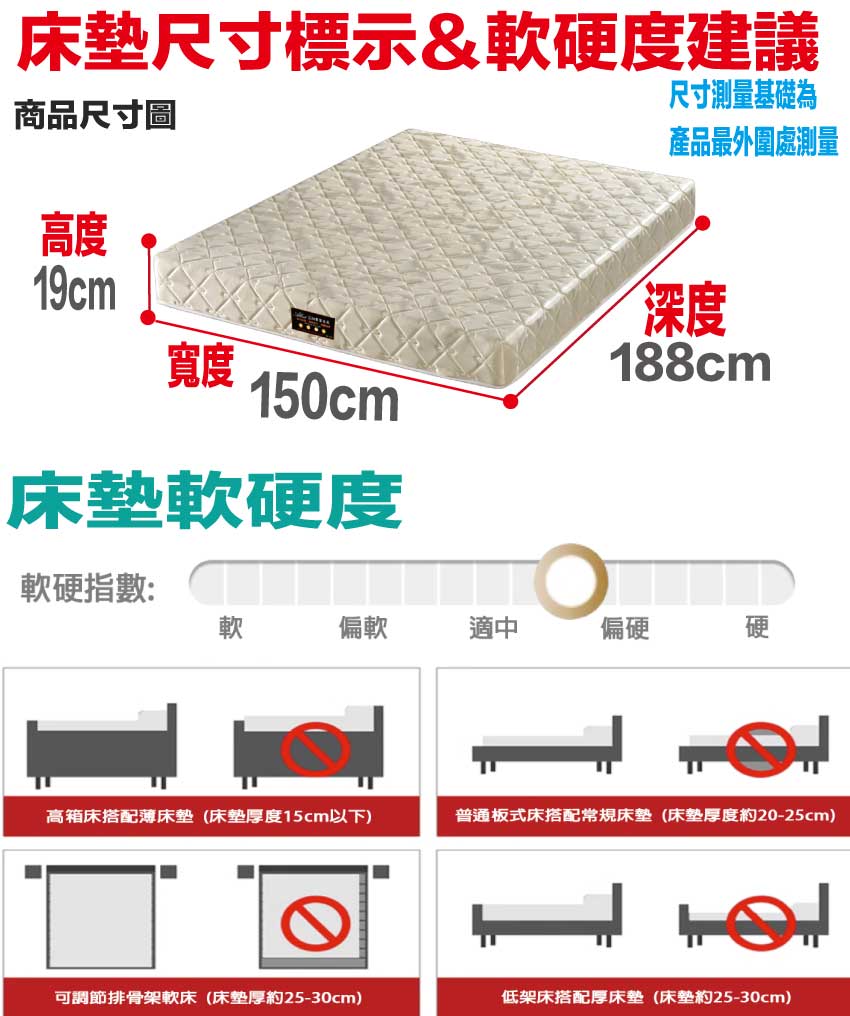 【文創集-床墊系列】5尺雙面防蟎緹花布&蓆面雙人彈簧床墊◆商品尺寸:(寬)150x (深)188 x (高)19公分◆商品材質:(A面)透氣緹花表布+(B面)透氣涼感蓆面+防穿刺透氣棉+止滑透氣底布 +加強型承托海綿+高張力結晶長織棉+備長碳釋壓棉+特殊氣流車花+連結硬式高碳鋼2.3mm線徑靜音抗擾中鋼彈簧◆商品保固:中鋼彈簧體保固5年(正常使用),保用10年本產品款式共有單人加大(105cm)&雙人(150cm)&雙人加大(180cm)等三種尺寸可供您選擇,請先確定床台的尺寸再購買