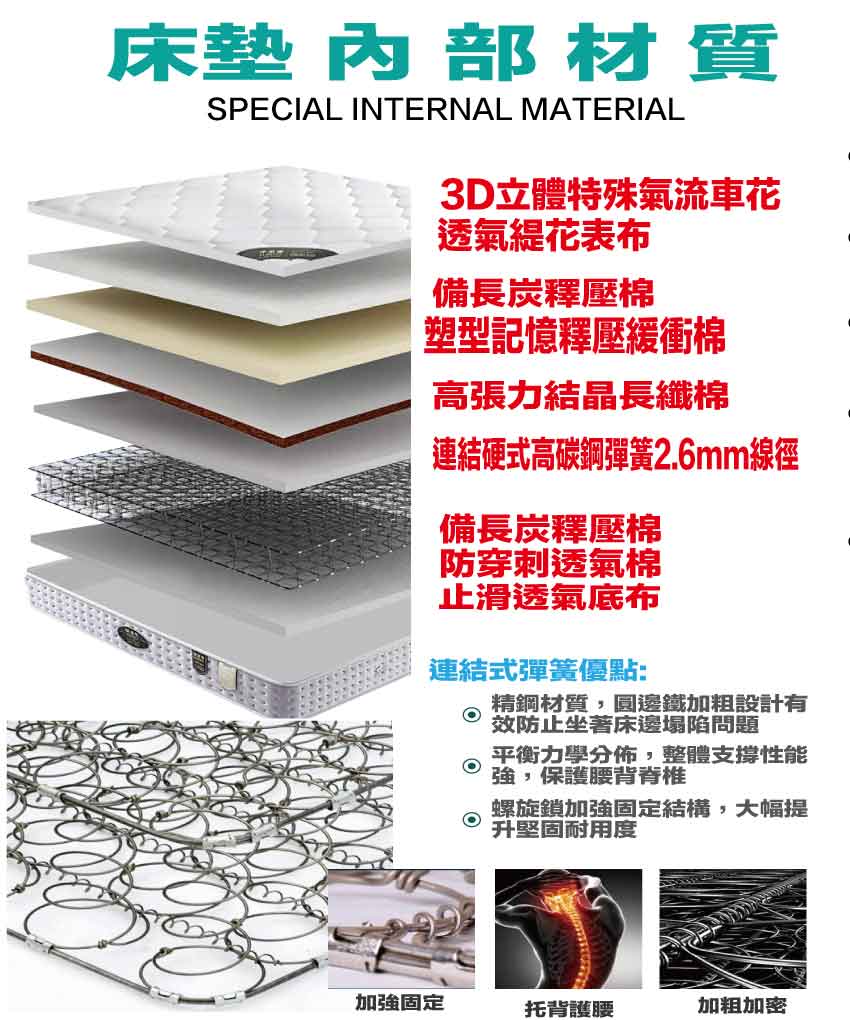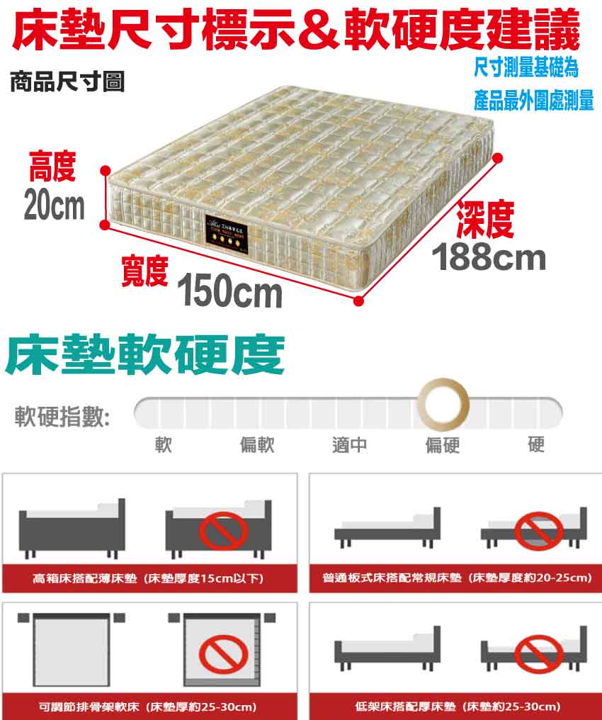 【文創集-床墊系列】5尺硬感聯結式雙人彈簧床墊◆商品尺寸:(寬)150x (深)188 x (高)20公分◆商品材質:透氣緹花表布+防穿刺透氣棉+止滑透氣底布 +加強型承托海綿+高張力結晶長織棉+備長碳釋壓棉+特殊氣流車花+連結硬式高碳鋼2.6mm線徑靜音抗擾中鋼彈簧◆商品保固:中鋼彈簧體保固5年(正常使用),保用10年本產品款式共有單人加大(105cm)&雙人(150cm)&雙人加大(180cm)等三種尺寸可供您選擇,請先確定床台的尺寸再購買
