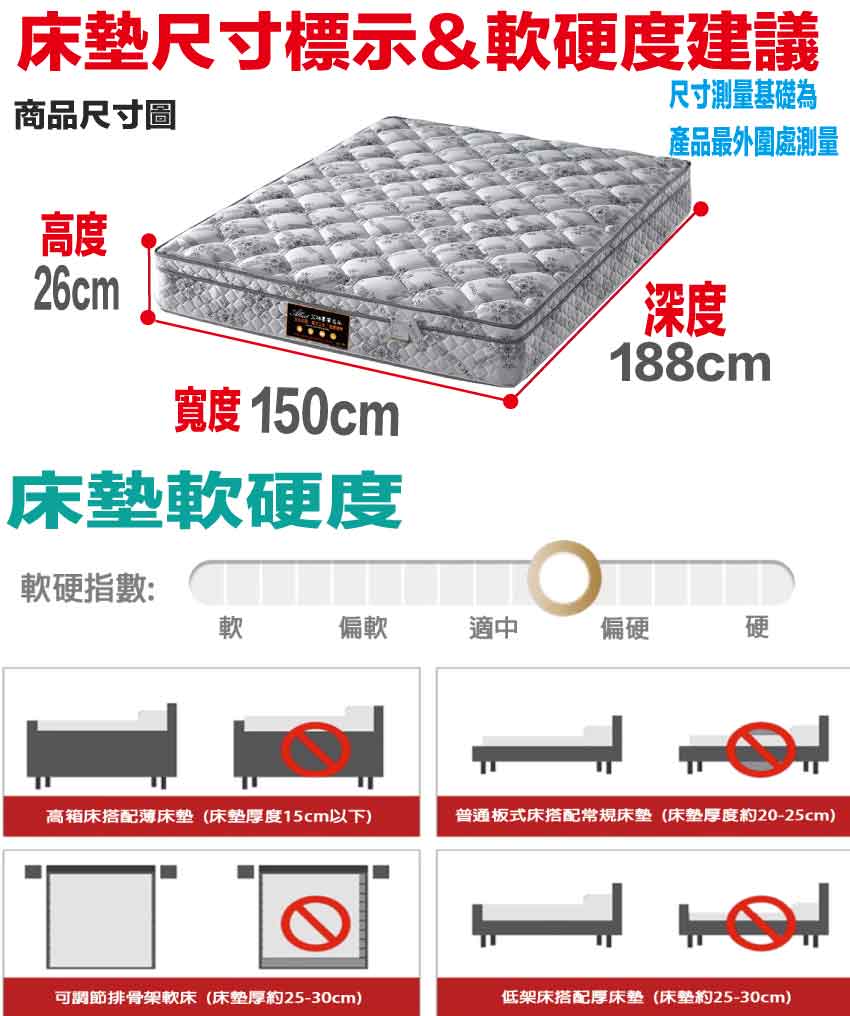 【文創集-床墊系列】抗菌天絲5尺雙人聯結式彈簧床墊◆商品尺寸:(寬)150x (深)188 x (高)26/公分◆商品材質:3D立體氣流車花+透氣緹花表布+瑞士Sanitized抗菌處理技術+防穿刺透氣棉+止滑透氣底布 +加強型承托海綿+高張力結晶長織棉+備長碳釋壓棉+連結硬式高碳鋼2.3mm線徑靜音抗擾中鋼彈簧◆商品保固:中鋼彈簧體保固5年(正常使用),保用10年本產品款式共有單人加大(105cm)&雙人(150cm)&雙人加大(180cm)等三種尺寸可供您選擇,請先確定床台的尺寸再購買