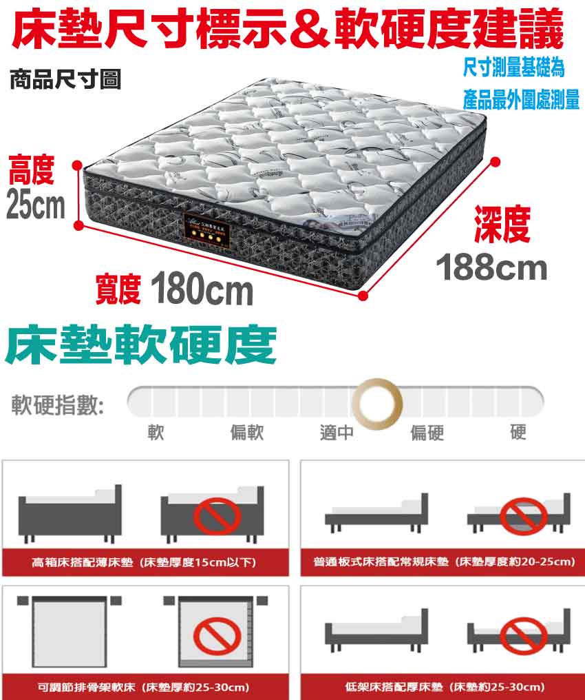 【文創集-床墊系列】3D抗菌舒活6尺雙人加大獨立筒床墊◆商品尺寸:(寬)180x (深)188 x (高)25公分◆商品材質:瑞士Sanitized抗菌處理技術針織舒柔布+防穿刺透氣棉+止滑透氣底布 +加強型承托海綿+高張力結晶長織棉+加強型四邊M型支撐邊框+3D立體特殊氣流車花+備長碳釋壓棉+高碳鋼836顆2.4mm靜音抗擾中鋼彈簧(袋裝獨立筒彈簧)◆商品保固:中鋼彈簧體保固5年(正常使用),保用10年本產品款式共有單人加大(105cm)&雙人(150cm)&雙人加大(180cm)等三種尺寸可供您選擇,請先確定床台的尺寸再購買