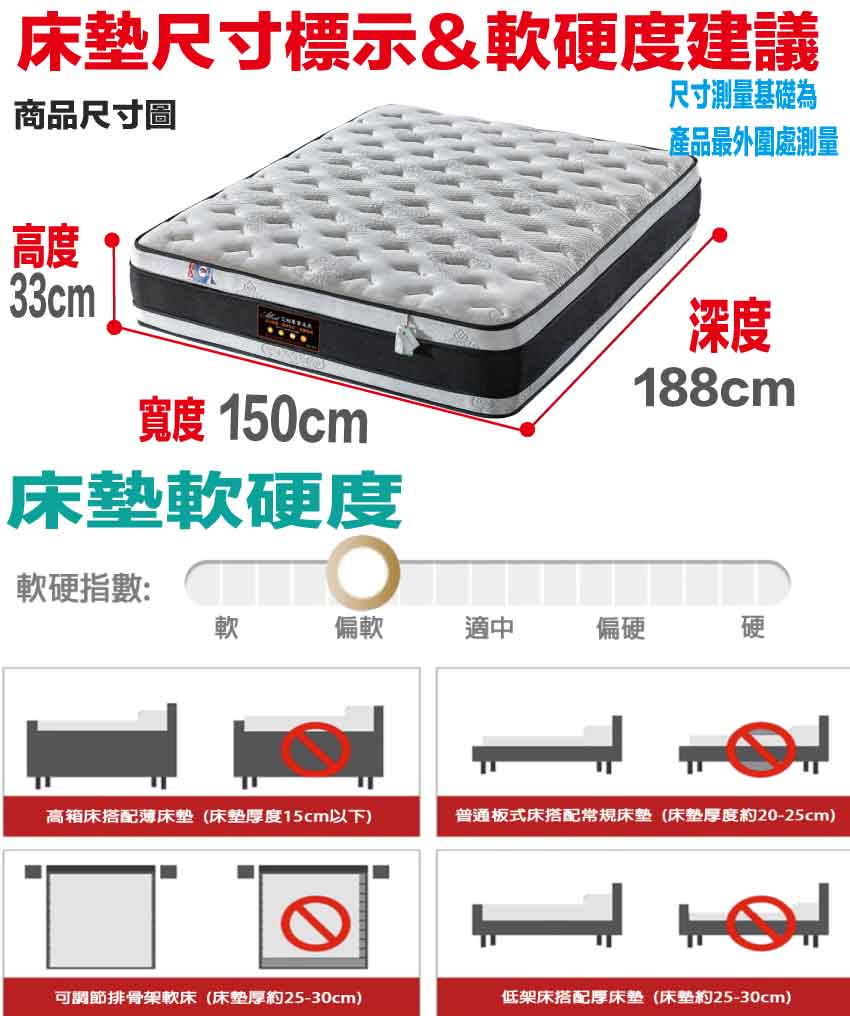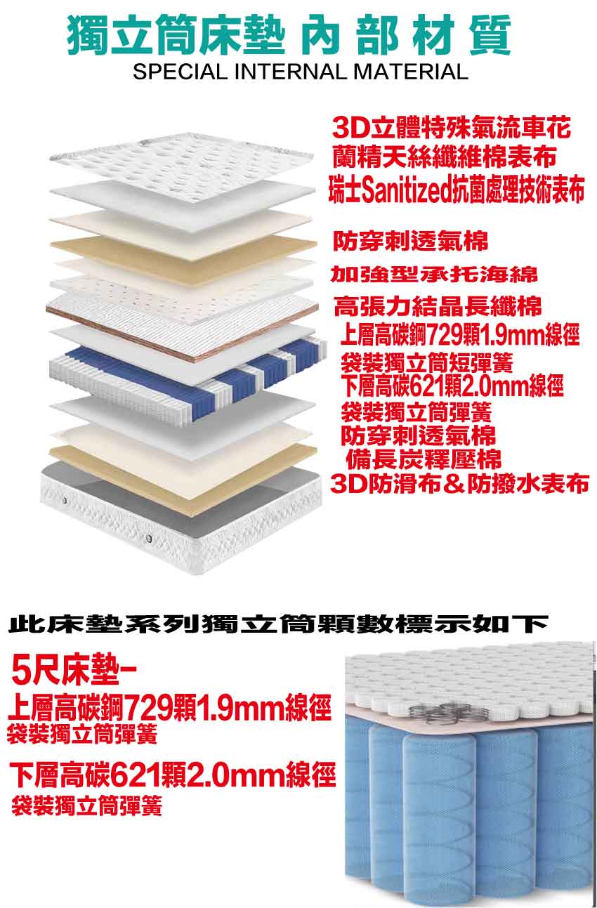 【文創集-床墊系列】3D天絲5尺雙人雙層獨立筒床墊◆商品尺寸:(寬)150x (深)188 x (高)33/公分◆商品材質:蘭精天絲纖維棉料表布+雙層獨立筒彈簧結構(上層高碳鋼729顆1.9MM獨立筒彈簧+下層高碳鋼621顆2.0MM獨立筒彈簧)+瑞士Sanitized抗菌處理技術針織舒柔布+防穿刺透氣棉+止滑透氣底布 +加強型承托海綿+高張力結晶長織棉+3D立體特殊氣流車花+備長碳釋壓棉此款床墊較為厚重搬運時不可彎壓,產品接單時會有專人和您確認電梯或是樓梯寬度,避免造成無法配送搬運造成您時間及成本損耗,請見諒◆商品保固:中鋼彈簧體保固5年(正常使用),保用10年本產品款式共有單人加大(105cm)&雙人(150cm)&雙人加大(180cm)等三種尺寸可供您選擇,請先確定床台的尺寸再購買