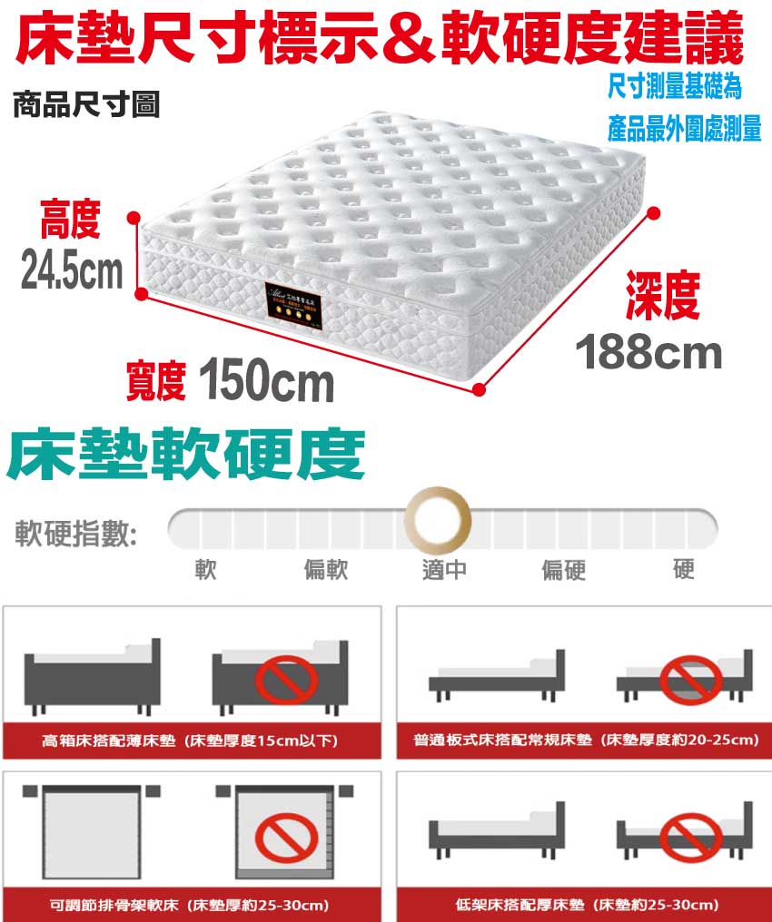 【文創集-床墊系列】3D天絲涼感紗5尺雙人獨立筒床墊◆商品尺寸:(寬)150x (深)188 x (高)24.5公分◆商品材質:蘭精天絲纖維+涼感紗表布+防穿刺透氣棉+PU360度鑽石護框 +加強型承托海綿+高張力結晶長織棉+3D立體特殊氣流車花+備長碳釋壓棉+高碳鋼626顆2.0mm靜音抗擾中鋼彈簧(袋裝獨立筒彈簧)+3D止滑&防潑水表布◆商品保固:中鋼彈簧體保固5年(正常使用),保用10年本產品款式共有單人加大(105cm)&雙人(150cm)&雙人加大(180cm)等三種尺寸可供您選擇,請先確定床台的尺寸再購買