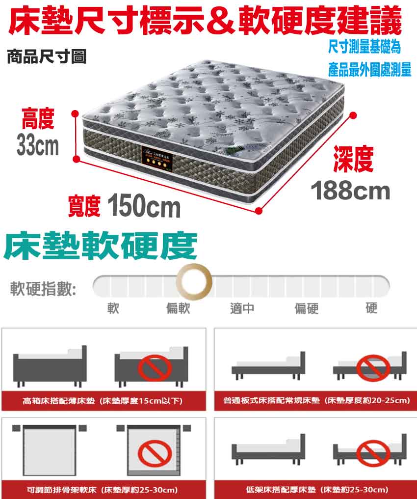 【文創集-床墊系列】3D抗菌乳膠5尺雙人獨立筒床墊◆商品尺寸:(寬)150x (深)188 x (高)33/公分◆商品材質:瑞士Sanitized抗菌處理技術針織舒柔表布+植物性天絲乳膠+防穿刺透氣棉+加強形承托海棉+高張力結晶長織棉+備長碳釋壓棉+立體特殊氣流車花+高碳鋼621顆2.0mm線徑袋裝獨立筒彈簧+M字型邊框加強支撐結構+3D止滑&防潑水表布此款床墊較為厚重搬運時不可彎壓,產品接單時會有專人和您確認電梯或是樓梯寬度,避免造成無法配送搬運造成您時間及成本損耗,請見諒◆商品保固:中鋼彈簧體保固5年(正常使用),保用10年本產品款式共有單人加大(105cm)&雙人(150cm)&雙人加大(180cm)等三種尺寸可供您選擇,請先確定床台的尺寸再購買