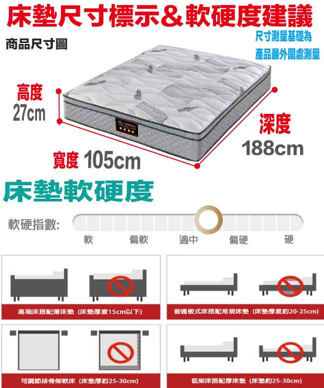 【文創集-床墊系列】3D天絲涼感紗3.5尺單人獨立筒床墊◆商品尺寸:(寬)105x (深)188 x (高)27/公分◆商品材質:涼感紗表布+瑞士Sanitized抗菌處理技術+M字型邊框加強支撐輔助結構+防穿刺透氣棉+加強型承托海綿+高張力結晶長織棉+3D立體特殊氣流車花+備長碳釋壓棉+高碳鋼556顆2.4mm靜音抗擾中鋼彈簧(袋裝獨立筒彈簧)+3D止滑&防潑水表布◆商品保固:中鋼彈簧體保固5年(正常使用),保用10年本產品款式共有單人加大(105cm)&雙人(150cm)&雙人加大(180cm)等三種尺寸可供您選擇,請先確定床台的尺寸再購買