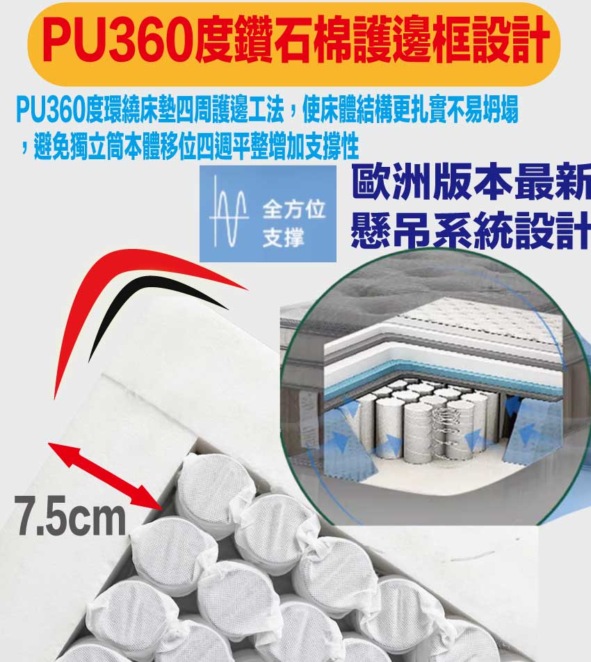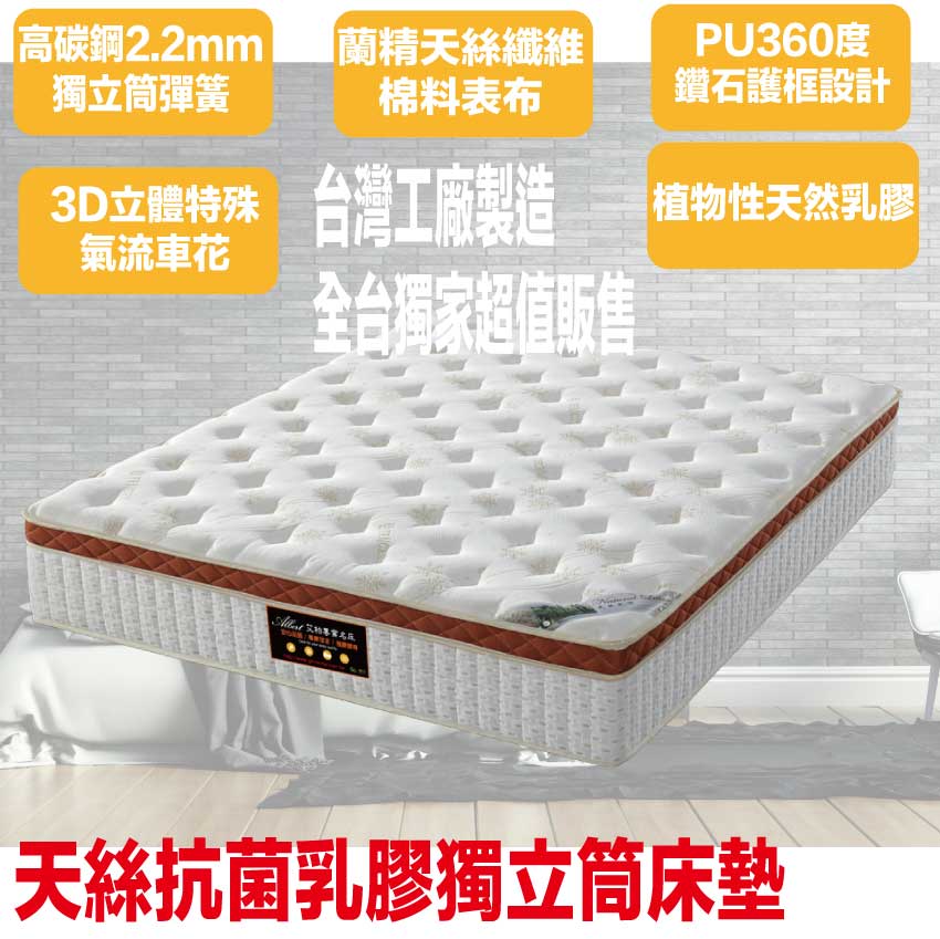 【文創集-床墊系列】3D天絲抗菌乳膠6尺雙人加大護框獨立筒床墊◆商品尺寸:(寬)180x (深)188 x (高)30/公分◆商品材質:蘭精天絲纖維棉料表布+植物性天然乳膠+瑞士Sanitized抗菌處理技術+防穿刺透氣棉+PU360度鑽石棉護邊框+高密度釋壓緩衝棉+高張力結晶長織棉+備長碳釋壓棉+立體特殊氣流車花+高碳鋼751顆2.2mm線徑袋裝獨立筒彈簧+3D止滑&防潑水表布此款床墊較為厚重搬運時不可彎壓,產品接單時會有專人和您確認電梯或是樓梯寬度,避免造成無法配送搬運造成您時間及成本損耗,請見諒◆商品保固:中鋼彈簧體保固5年(正常使用),保用10年本產品款式共有單人加大(105cm)&雙人(150cm)&雙人加大(180cm)等三種尺寸可供您選擇,請先確定床台的尺寸再購買