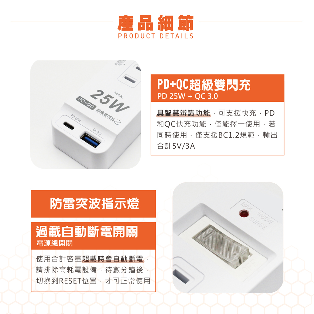 全台首創!科技散熱陶瓷-每個插座皆有裝高科技散熱陶瓷,陶瓷有耐高溫性接觸熱能散熱更快!符合BSMI新安規2 USB,智慧辨識PD25W+QC3.0防雷擊突波保護PTP高溫斷電指示燈過載斷電總開關本體防火耐熱材質插座防火PC材質雙阻燃絕緣線USB充電插座適用iphone2.0mm導線,千足銅insideTYPEC PD25W專用充電插座三面插座設計▼商品規格品名:日亞 2孔1開3插 2 USB快充PD25w +QC 1.8米延長線型號:C-08P25L規格:2孔插1開關3插座2 USB(PD+QC)長度:6尺1.8m主要材質:銅、PC塑膠USB額定輸入電流:0.6AUSB輸出總功率:25WUSB輸出:TypeA-5V/3.0A、9V/2.77A、12V/2.08A,TypeC-5V/3.0A、9V/2.77、12V/2.08A(PD、QC快充功能只能擇一使用,同時使用時輸出合計5V/3A。)(設備本身不具任何充電協議時,TypeA支援DCP DE提供1.5A,TypeC不支援無快充協議充電)額定電壓:AC125V額定電流:15A額定容量:MAX 1650W最大突波吸收能量:25焦耳最大突波吸收電壓:2500V最大突波吸收電流:1200A製造日期:標示於包裝上產地:中國(台商製造,日本品質)保存期限:常溫保存10年驗證登錄:R64847 RoHS保固:新品瑕疵保固 ※使用前請先詳閱包裝上使用說明※圖片僅供參考,商品依實際供貨為準。※商品如有顏色區別,未特別說明則採隨機出貨,不供挑色。※商品如經拆封、使用、或拆解以致缺乏完整性及失去再販售價值時,恕無法退(換)貨!※產品文案為原廠(供應商)所提供,若有變動敬請參照實際商品為準。※請勿盜用圖片進行商業用途,違者必究