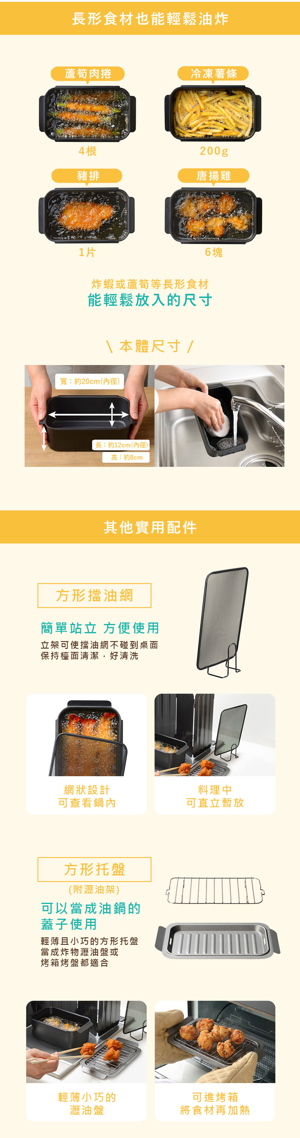 ※本組合內容: 油炸鍋本體、方型擋油網、方型托盤(附瀝油架)。