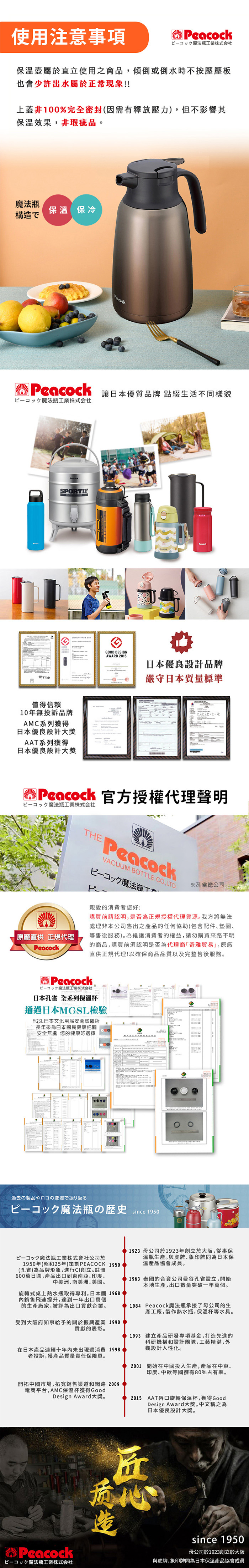 日本孔雀Peacock母公司於1923年創立於大阪,從事保溫瓶生產。與虎牌、象印牌同為日本保溫產品協會成員。十年零投訴的優質品牌-日本孔雀,百年的匠心質造,有情懷有態度,成就百年品牌,值得您安心使用。