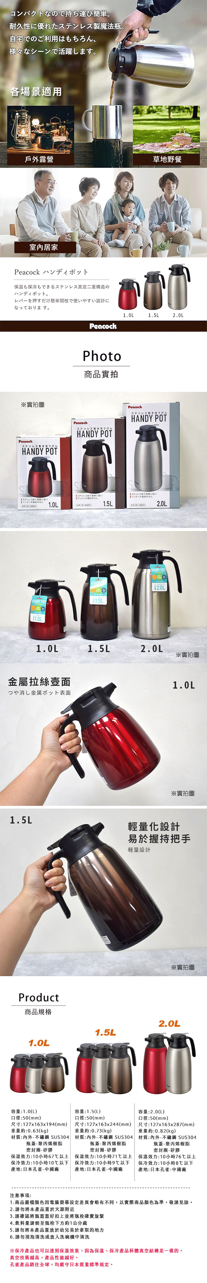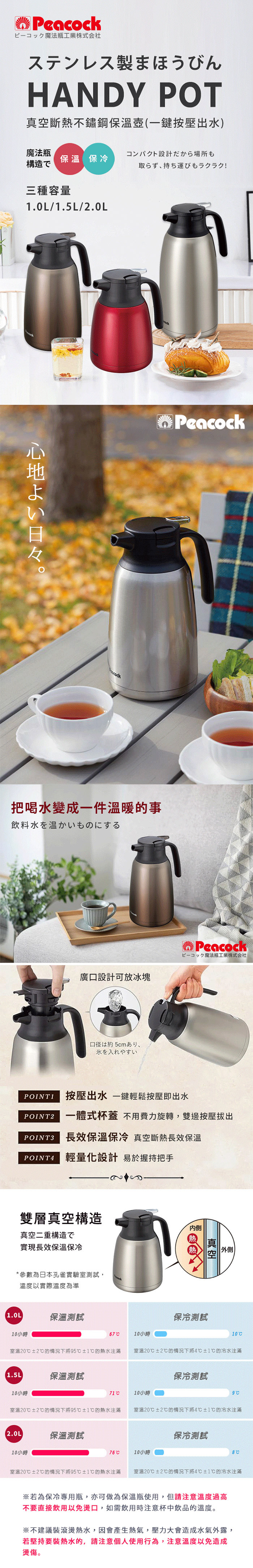 ●一鍵按壓出水●便捷拆卸提拉式壺蓋●真空斷熱長效保溫●不鏽鋼內膽更穩定,耐衝擊●三種尺寸 1.0L / 1.5L / 2.0L