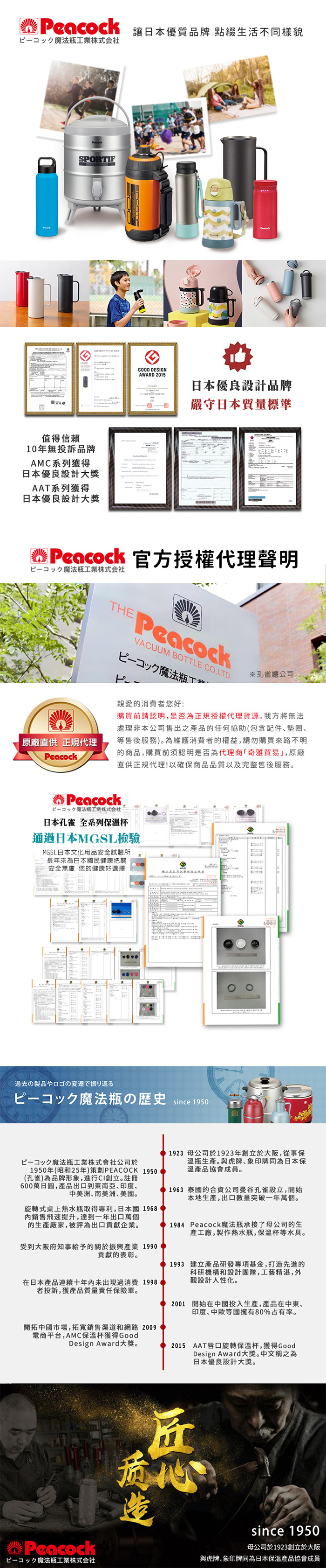 日本孔雀Peacock母公司於1923年創立於大阪,從事保溫瓶生產。與虎牌、象印牌同為日本保溫產品協會成員。十年零投訴的優質品牌-日本孔雀,百年的匠心質造,有情懷有態度,成就百年品牌,值得您安心使用。