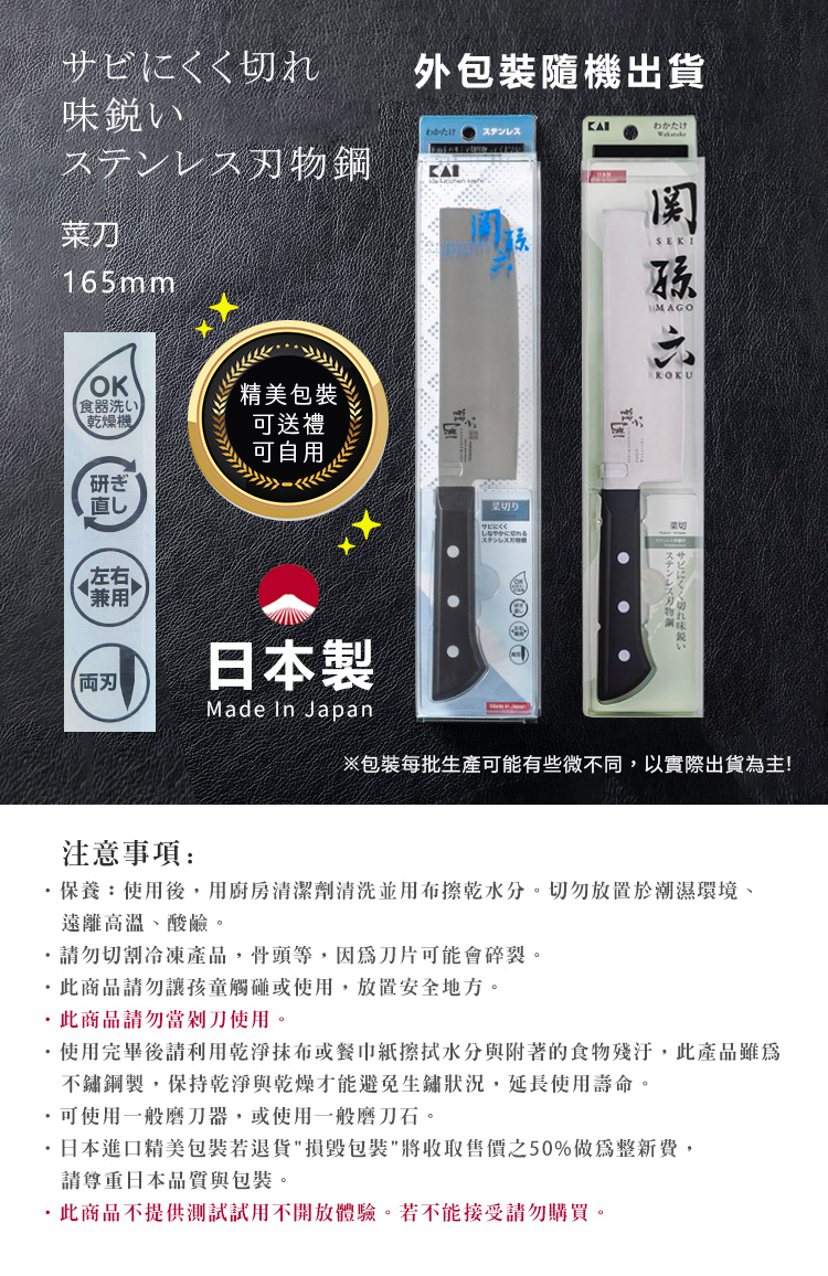 ‧保養:使用後,用廚房清潔劑清洗並用布擦乾水分。切勿放置於潮濕環境、遠離高溫、酸鹼。‧請勿切割冷凍產品,骨頭等,因為刀片可能會碎裂。‧此商品請勿讓孩童觸碰或使用,放置安全地方。‧此商品請勿當剁刀使用。‧使用完畢後請利用乾淨抹布或餐巾紙擦拭水分與附著的食物殘汙,此產品雖為不鏽鋼製,保持乾淨與乾燥才能避免生鏽狀況,延長使用壽命。‧可使用一般磨刀器,或使用一般磨刀石。‧日本進口精美包裝若退貨"損毀包裝"將收取售價之50%做為整新費,請尊重日本品質與包裝。‧此商品不提供測試試用不開放體驗。若不能接受請勿購買。
