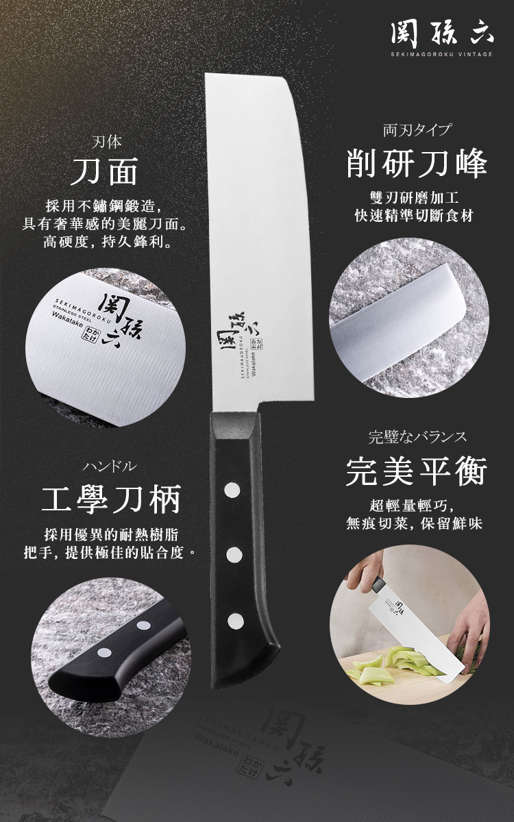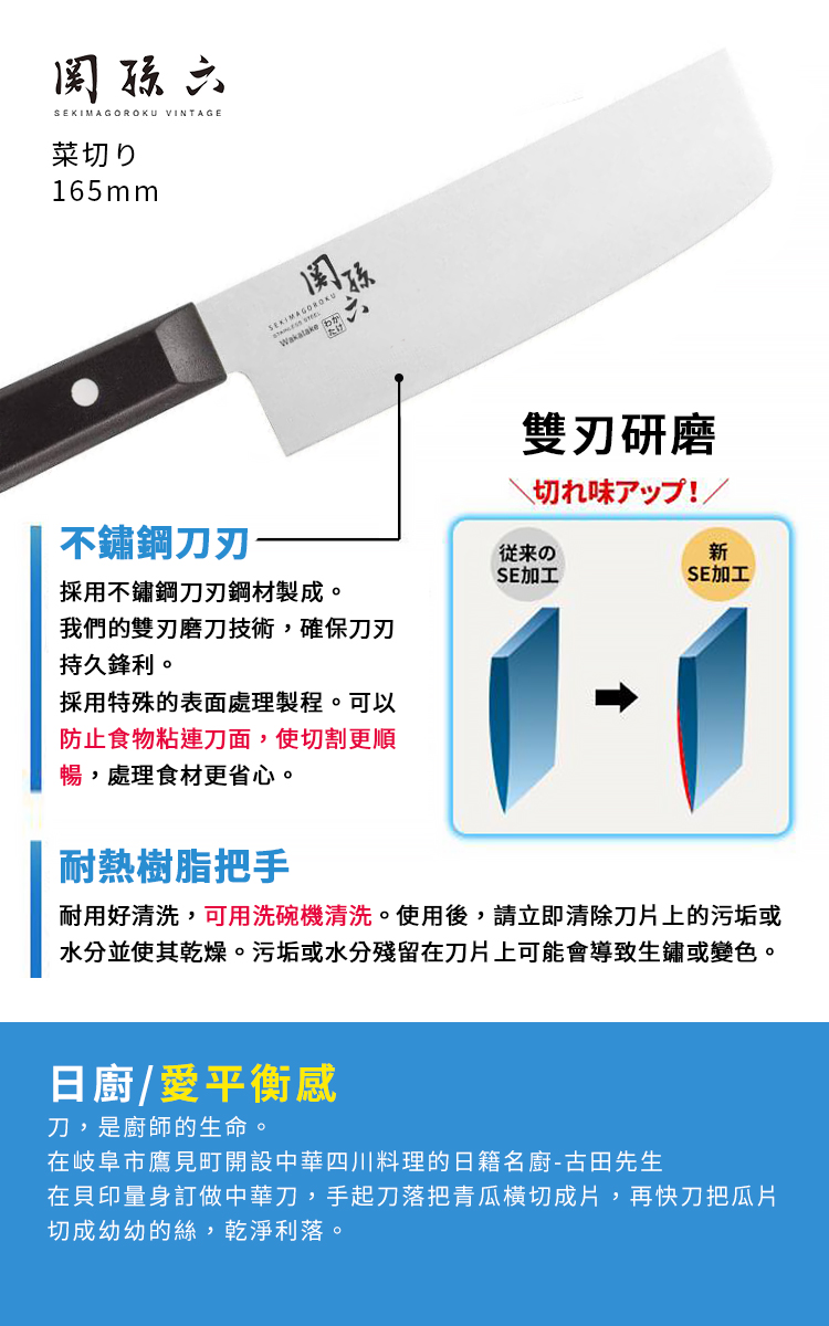 ●日本製 日本家庭用廚刀●職人匠造不鏽鋼製●單層不鏽鋼,防鏽且易於保養●刀柄與刀身比例均衡●符合人體工學、省力、手感舒適