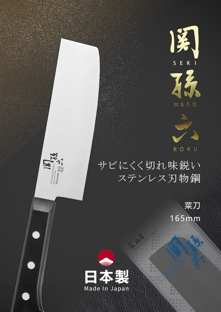 貝印另一高級系列「關孫六」,「關孫六」的鍛造者名為二十七帶名目兼元金子孫六氏,他所鑄造的刀劍,有「最上大業物」(日本刀劍史上最高榮譽)的美譽,為日本名刀劍之一,而該系列就是傳承了這位名匠對刀藝的美學與執著,將鑄造名刀劍的精神運用在製作家用刀具上。秉持鎌倉時代著名刀匠—關孫六的製刀精神,作工精細並具獨特藝術性,其刀面鋒利度更是上品之選。