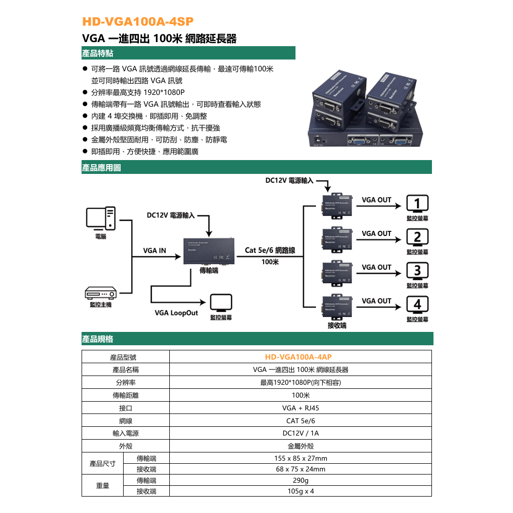 昌運監視器 HD-VGA100A-4SP VGA 一進四出 100米 網路延長器