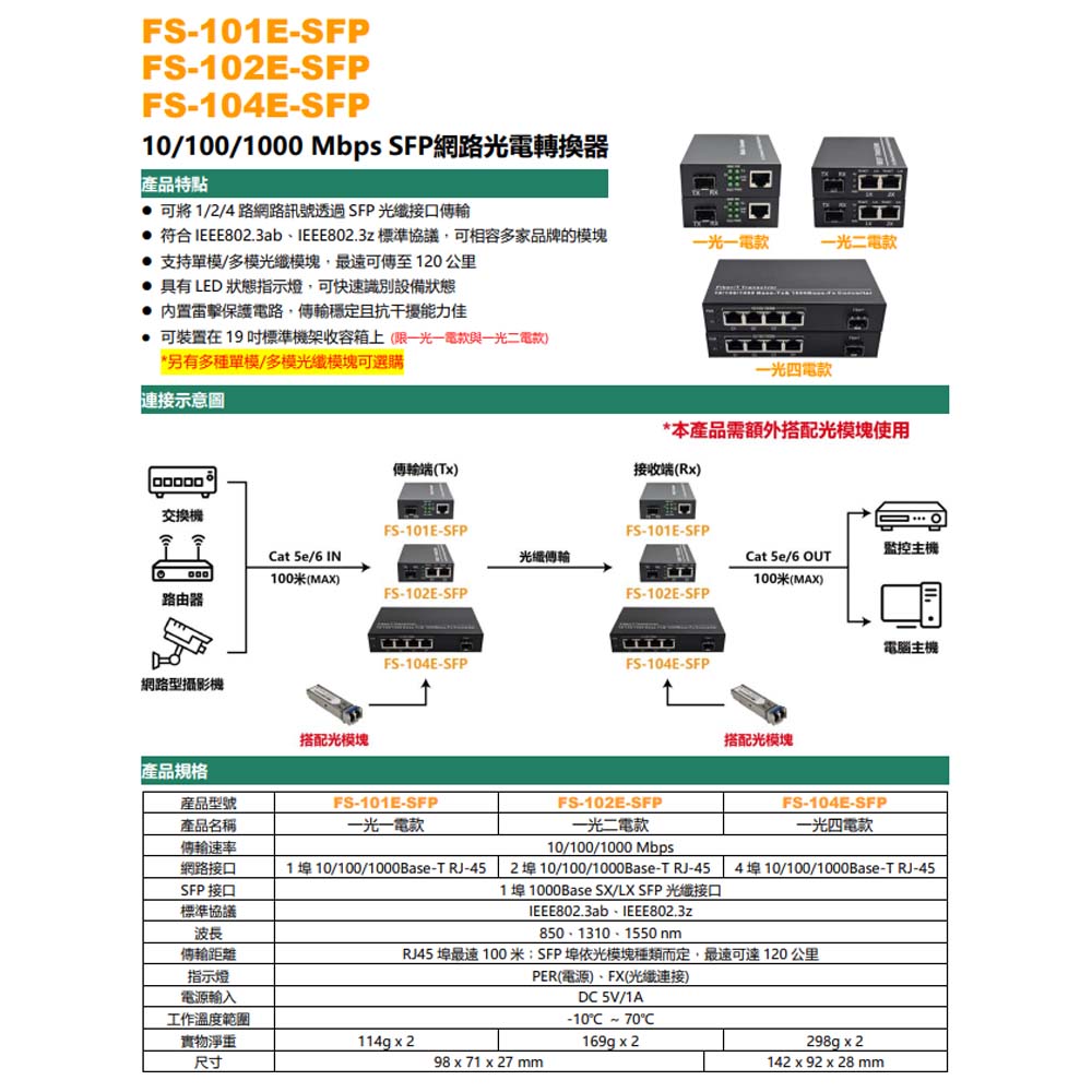 昌運監視器 FS-102E-SFP 10/100/1000 Mbps SFP網路光電轉換器(一光二電款)