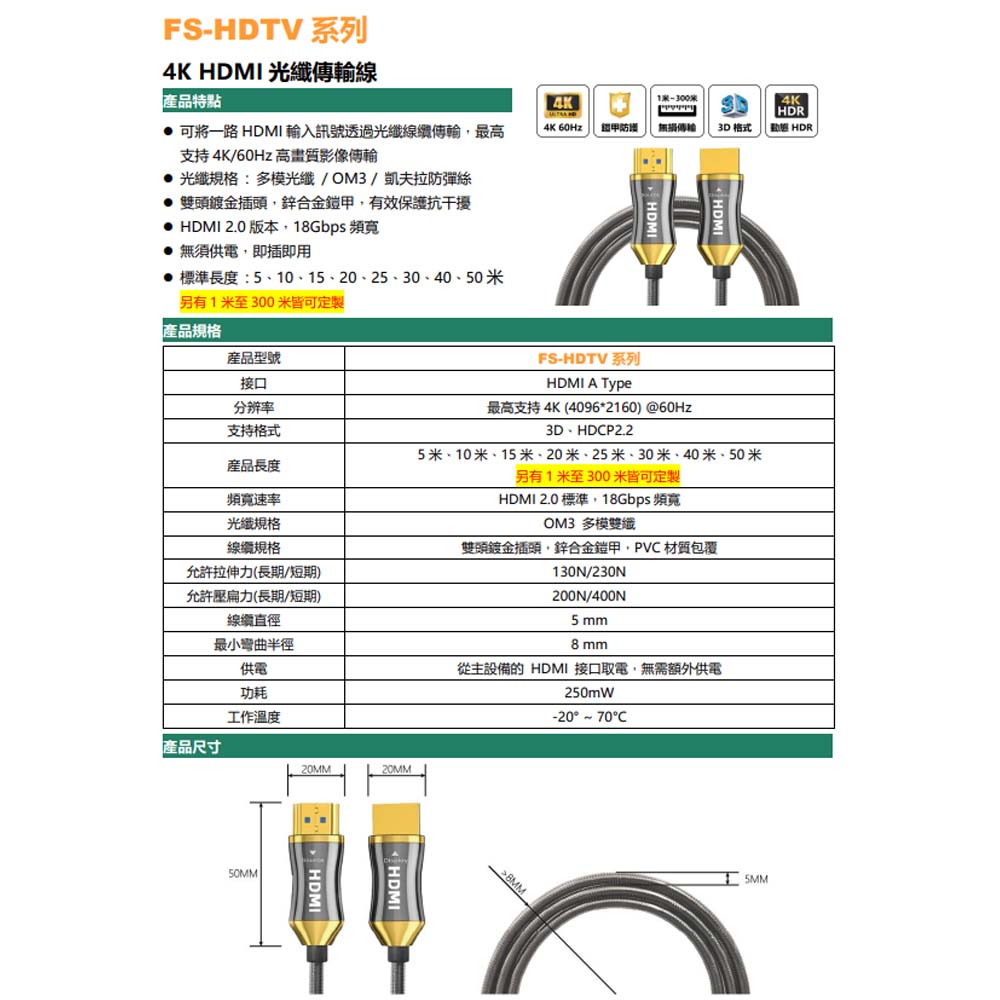 昌運監視器 4K HDMI 光纖傳輸線-15米