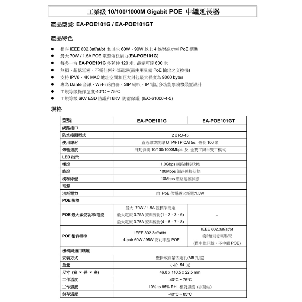 最大70W / 1.5A POE電源傳送能力(EA-POE101G)