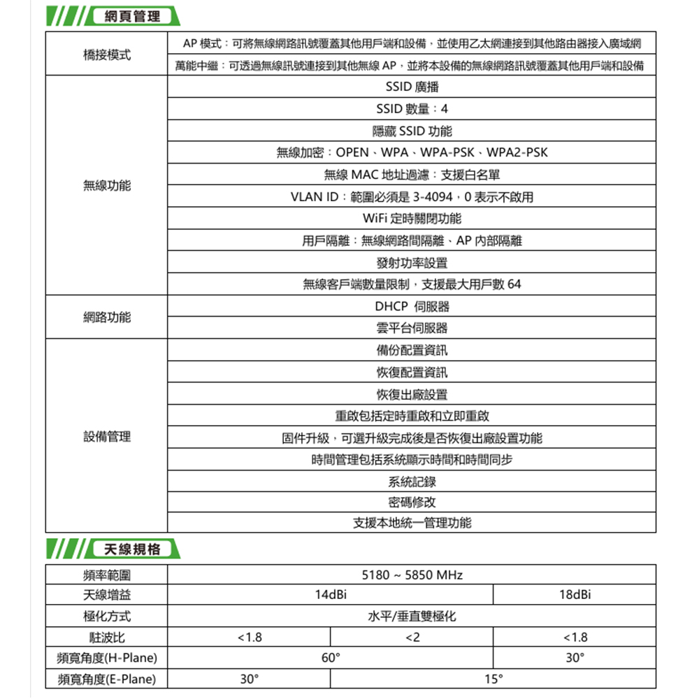 -支持WLAN QoS功能、WMM協議、本地管理、自動功率調整、通道選擇及多項模式控制。