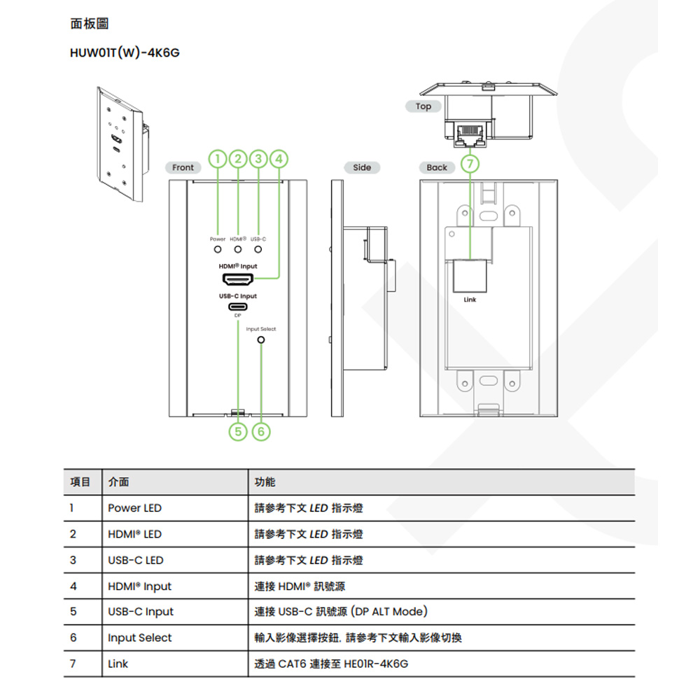 HUW01(W)-4K6G 是一款符合美規面板尺寸的 HDMI® 與 USB-C 面板式影音延長器,可透過一條 CAT6 網路線傳輸影音訊號與電力,最遠可延伸達 70 公尺,支援最高 4K 60Hz 解析度。具備 HDMI® 與 USB-C 兩種輸入介面,提供使用者靈活的影音來源選擇。