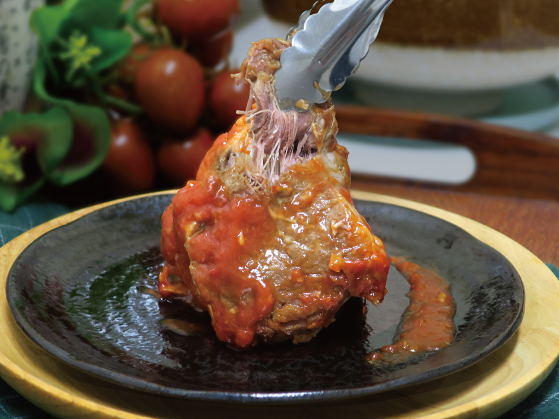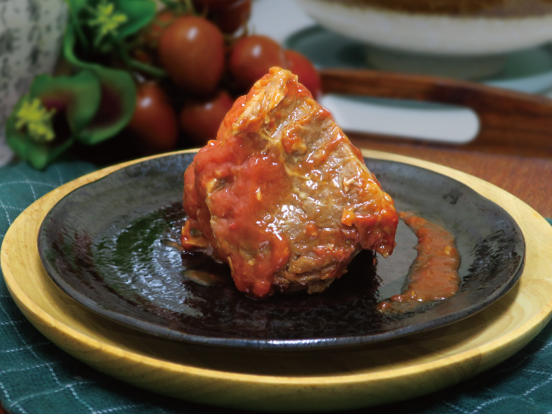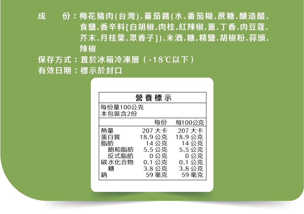 梅花豬肉(台灣)、番茄糊〔水.番茄糊.蔗糖.釀造菌.食鹽.香辛料(白胡椒.肉桂.紅辣椒.薑.丁香.肉豆蔻.芥末.月桂葉.眾香子)〕、米酒、糖、精鹽、胡椒粉、蒜頭、辣椒