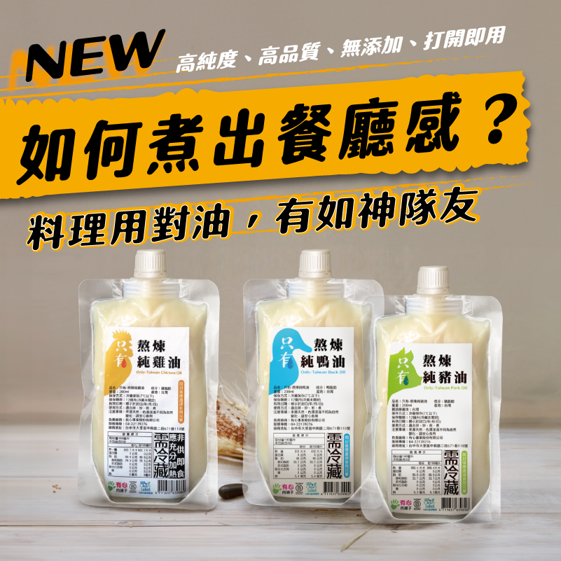 來自台灣安心飼養櫻桃鴨、獸醫把關、藥殘合格以水蒸氣120 °C慢熬提煉,完整保留鴨油精華不高溫精煉,不調味,不加防腐劑,耐高溫180 °C高純度鴨油,獨特香氣,入菜更昇華適合油封/炒菜/煮湯/拌飯麵/各式料理料理用對油,增色添香,煮出餐廳感!