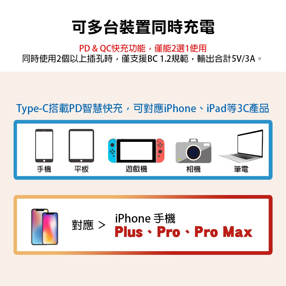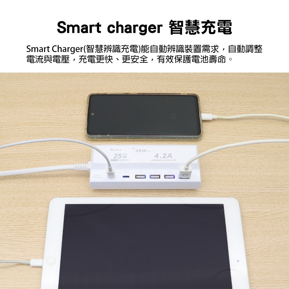 充電器內置有Smart IC,能自動偵測每孔插充之設備所需的電流、進而提供最穩定的充電品質,保護裝置產品。