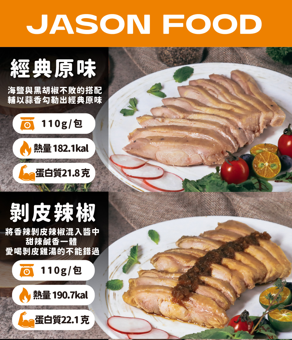 📢【杰森食代】全品項商品,單筆消費滿$1299享免運費📢【杰森食代─享受簡單美味 感受幸福滋味】 杰森以獨特的調理法調配出秘密配方,透過專業的溫度控制使雞腿肉鮮嫩多汁,簡單、方便、快速補充所需你的營養。📢 產品:舒肥嫩雞腿 110G/包 📢【源頭管理,食材把關】杰森食代擁有ISO22000暨HACCP食安系統認證嚴選雞腿帶皮清肉,經過層層品質檢驗。從源頭把關,安全送到您的餐盤上。📢什麼是舒肥(Sous vide) ?舒肥法是一種通過低溫度長時間加熱的烹飪方法,目的是要帶出原料(尤其是肉類)的最佳效果,透過將空氣抽掉的方式避免食材因氧化而破壞品質,藉由對時間和溫度的精準控制,能讓食材均勻受熱,並保留住最多的養分、水分與自然風味,創造一份份幸福美味。