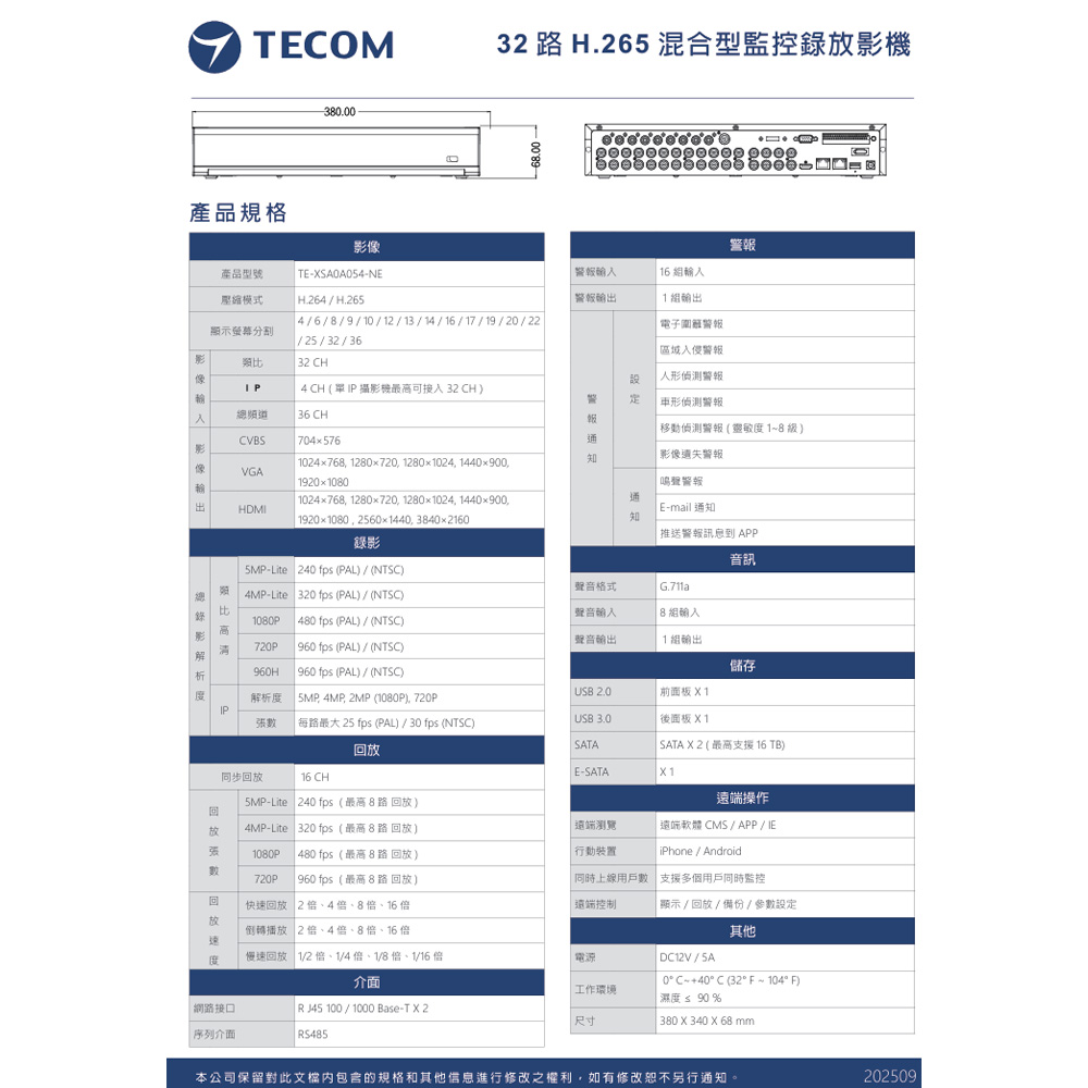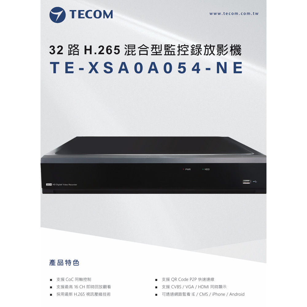 昌運監視器 東訊TECOM TE-XSA0A054-NE 32路H.265混合型監控錄放影機